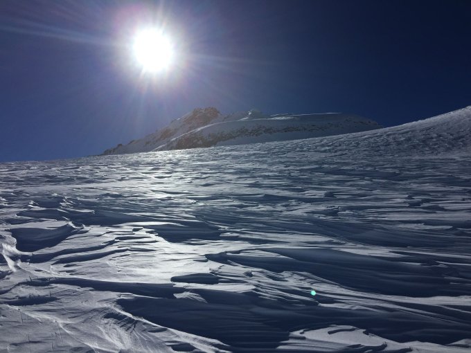 Schnee: Pulver von All'Acqua bis unterhalb Passo San Giacomo, dann zunehmend durch Wind bearbeitet. Couloir Kastellücke z.T. hart (Harscheisen hilfreich, aber nicht zwingend). Abfahrt bis ca 2550 m in gutem Schnee. Aufstieg auf dem Gletscher Pulver mit Winddeckel. Basodino Gletscher stark windbearbeitet (Zastrugis). Gletscher sehr gut eingeschneit: keine Spälte sichtbar (ausser unterhalb P. 2927, aber gut umgehbar). Gipfelhang Pickelhart: für den Aufstieg zum Gipfel sind Steigeisen und Eispickel unerlässlich.