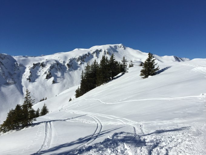 Von der Sünserspitz Abfahrt nach Norden Richtung Bleichten Alpe zur Talstation Mellau mit noch herrlichem Pulverschnee.