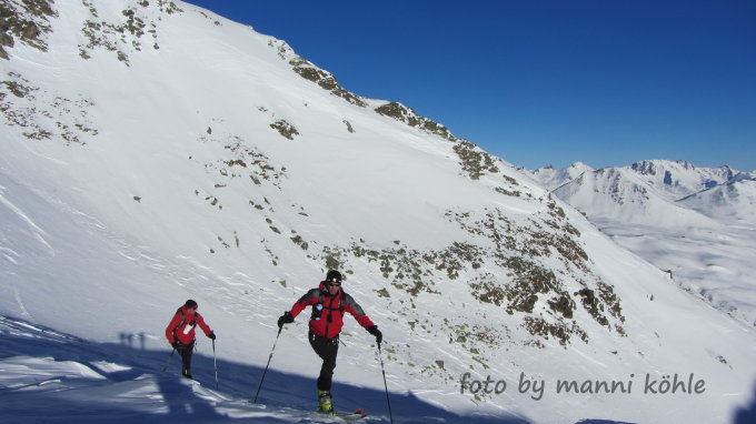 Nur wenige Pulverschnee abschnitte noch dabei, im oberen Bereich alles verblasen und keine guten Verhältnisse zum Abfahren.