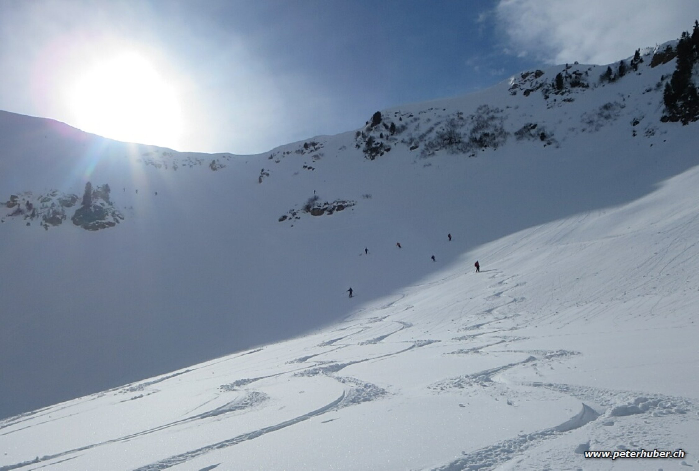 Entgegen der Wetterprognose recht schön und warm. Auf dem Grat ging ein heftiger Wind. Genügend Schnee bis nach Mühlehorn hinunter. Oberhalb 1200 m oft schöner Pulver, darunter feucht und oft pistenartig ausgefahren.