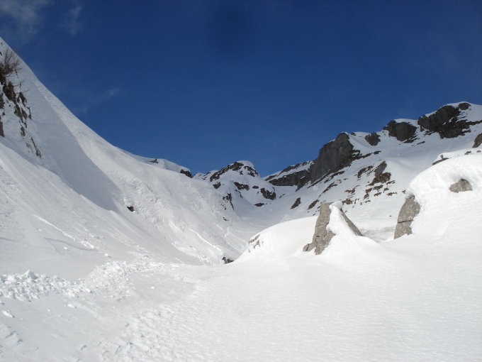 Abfahrt Richtung Osten, oben Frühlingsschnee dann Pulverschnee kurzer wechel mit Triebschnee , ab Alp Waldi wieder sehr schöner Pulverschnee bis Schwandboden.