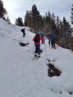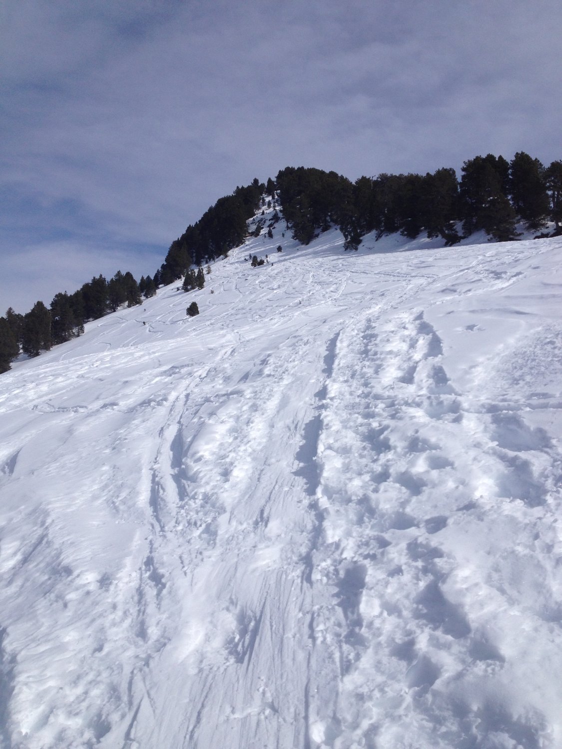 Fester und teilweise harter Schnee. Schattseitig Pulverschnee. Steilstufe gut fahrbar.