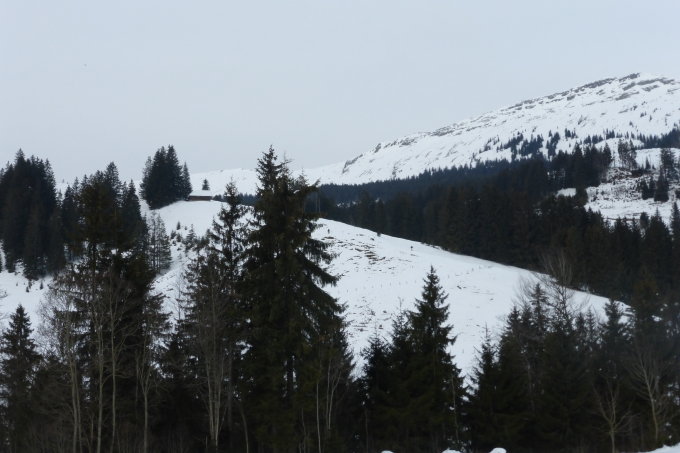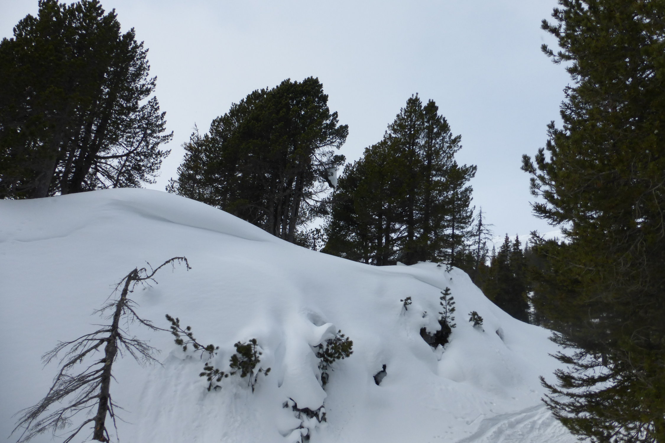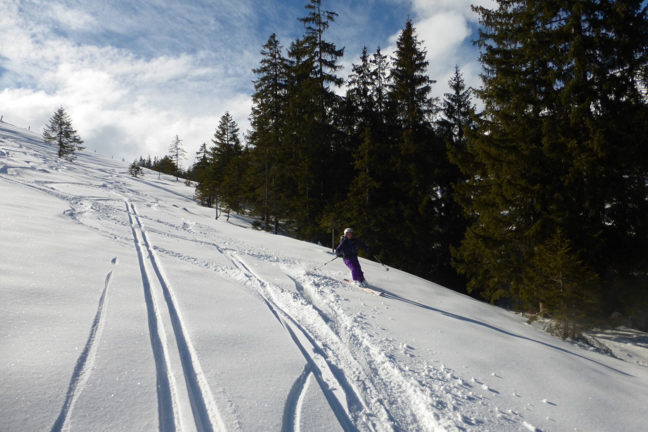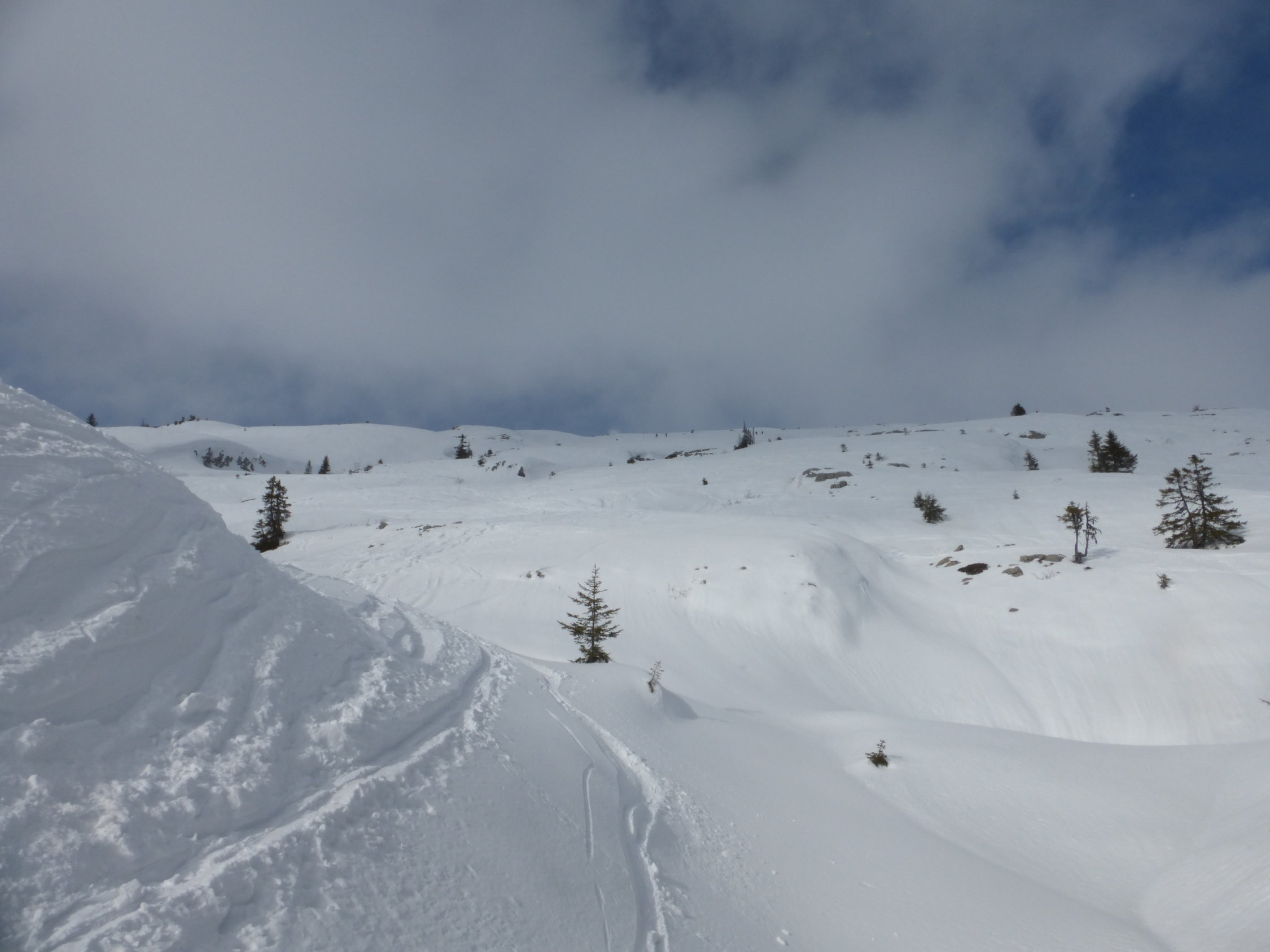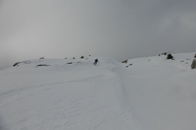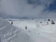 Dafür herrliche Abfahrt in noch unbefahrenen Hängen bis zur Mitte vom Wald. Teilweise in Mulden noch Pulverschnee angetroffen. Dies auch im Wald..und sogar noch unterhalb Schlund...Alles noch drehbar,vorallem im offenen Gelände häufen sich die Stellen mit Windharsch und Kruste.Die Hauptroute ist schon recht ausgefahren mit teilweise fast pistenartigen Verhältnissen.