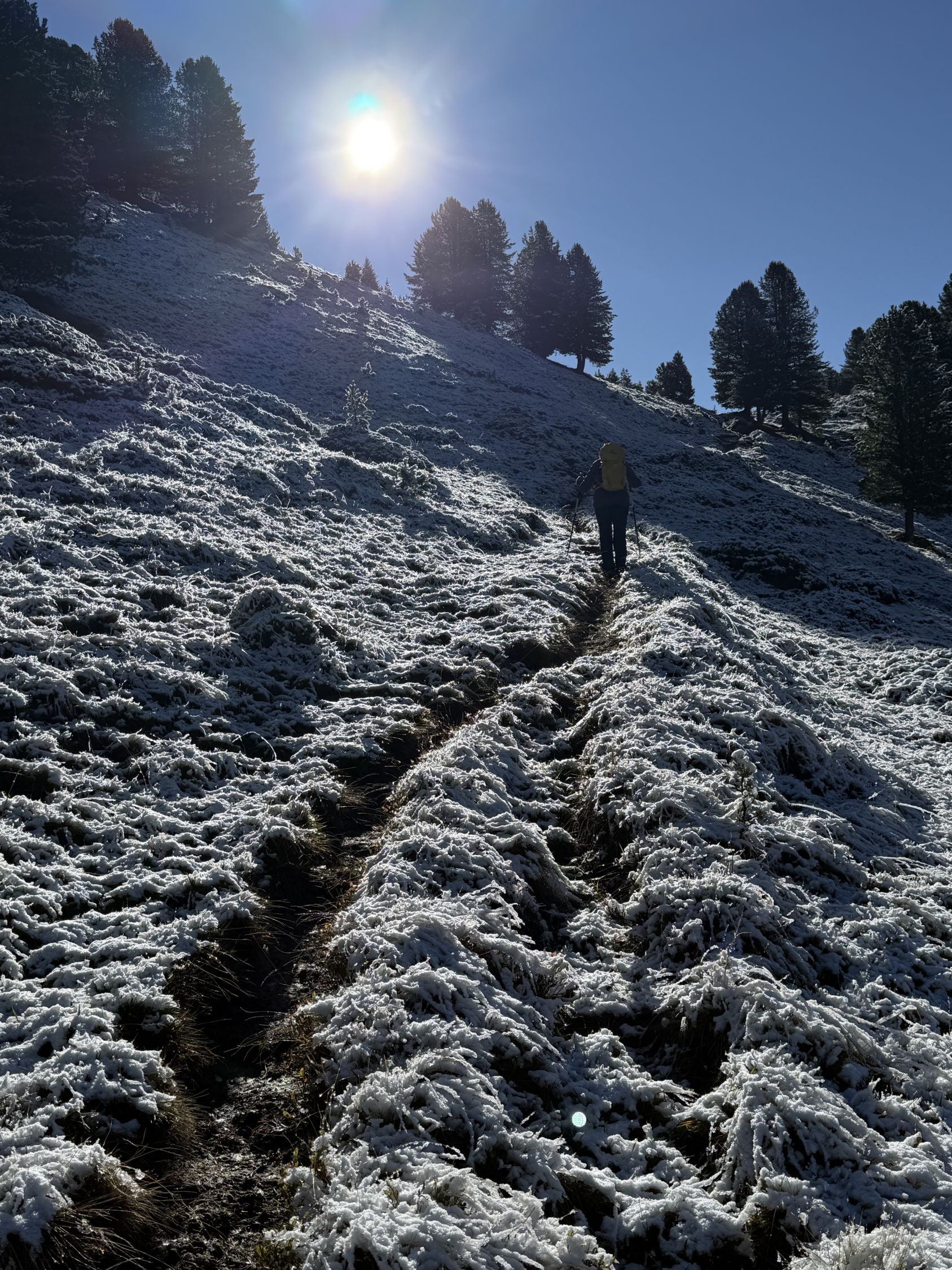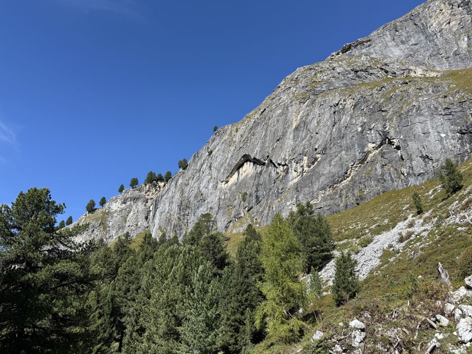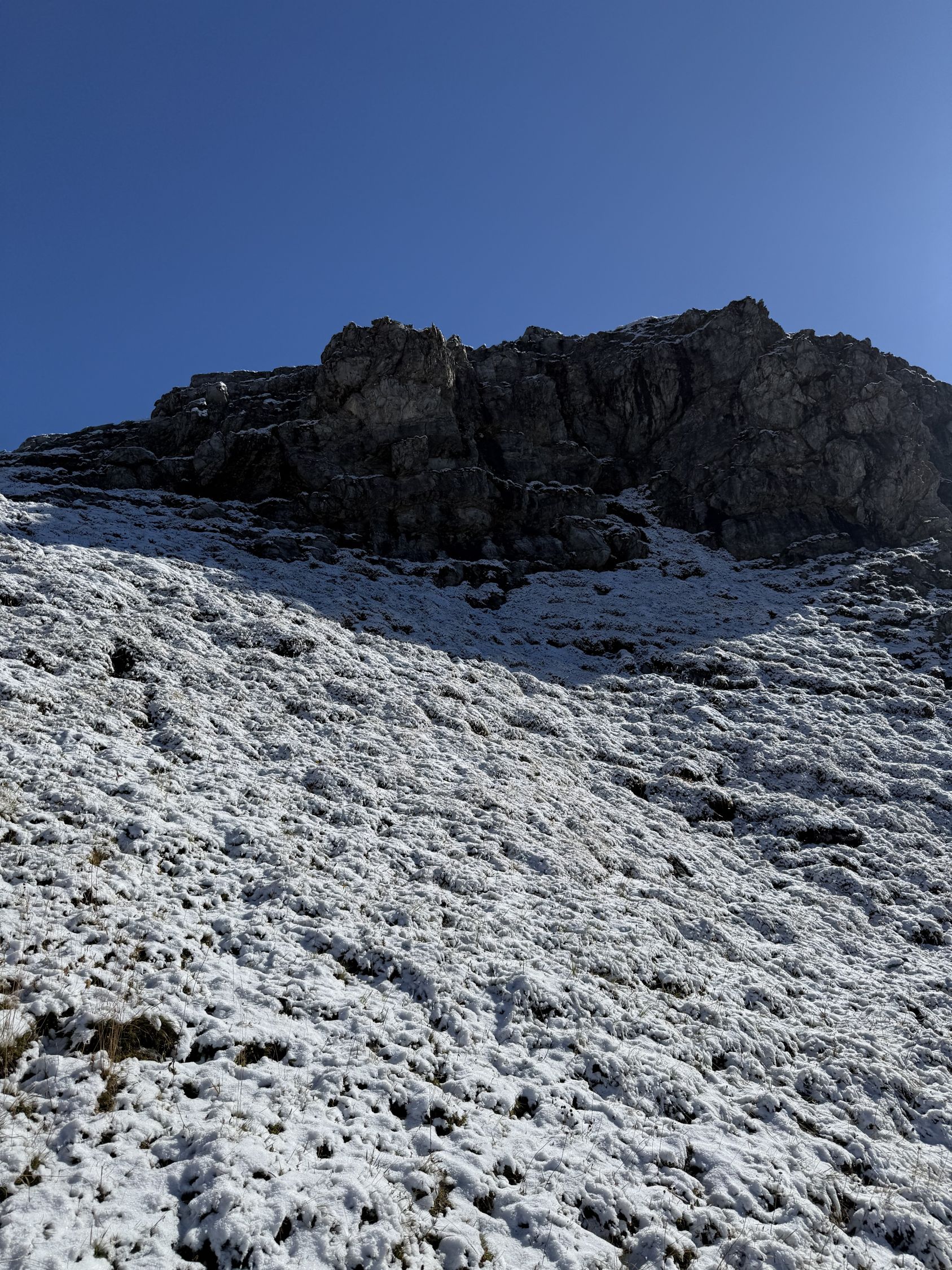 Winterliche Rundtour auf den Grat und unter den markanten Felswänden zurück nach Preda, T3+. ÖV Tour, Start Bahnhof Preda 8.30, 0 Grad, blauer Himmel, windstill. Im Wald kein Schnee, ab Punkt 2138 Schnee bis zum kleinen Gipfel auf dem Westgrat Igl Compass Höhe 2400 m. Abstieg im Schnee zu Punkt 2139 und ohne Schnee unter den markanten Felswänden nach Preda.