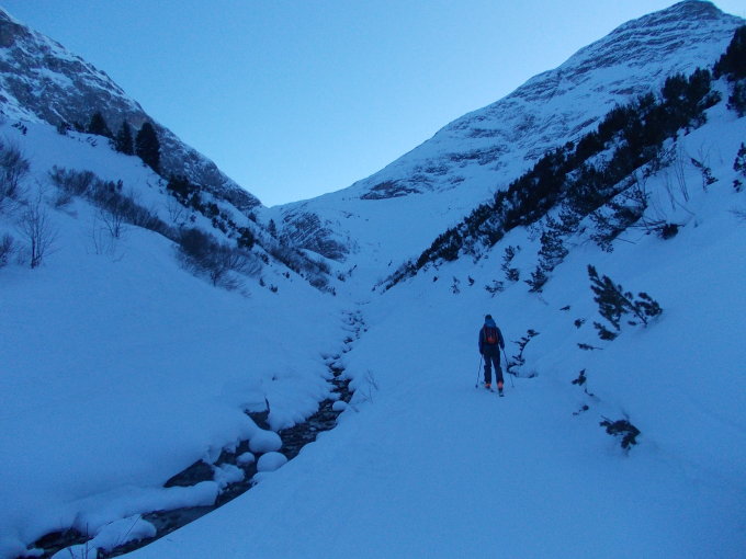 Gemeinschaftstour mit Stefan auf Skiern und mir mit Schneeschuhen. Wegen unserer späten Abfahrt von zuhause und anschließendem längeren Stauaufenthalt auf der Autobahn starteten wir erst nach 17 Uhr in Zug. Somit wurde das Stierlochjoch in der Dunkelheit überschritten, was wir aber als ein eher erquickliches, denn negatives Erlebnis wahrnahmen. Ein weiterer Vorteil war, dass uns auf dem Weg zum Stierlochjoch Gegenverkehr durch für gewöhnlich vom Mahdlochjoch herabkommende Variantenfahrer erspart blieb.