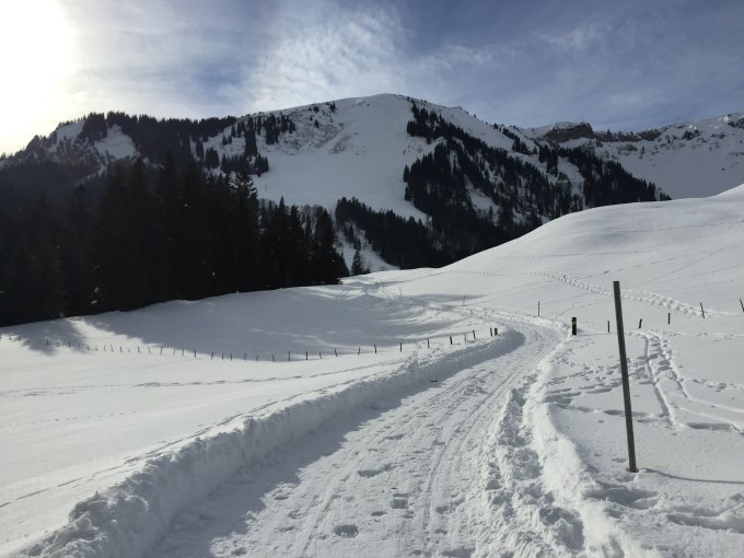 Aufgrund der vorteilhaften Lawinenwarnstufe ist die Nordflanke schon gut durchgepflügt. Jedoch gibt es von den wenigen Engstellen abgesehen immer noch die ein oder andere freie Linie. Die Wärme der letzten Tag hat dem Schnee allerdings schon zugesetzt.