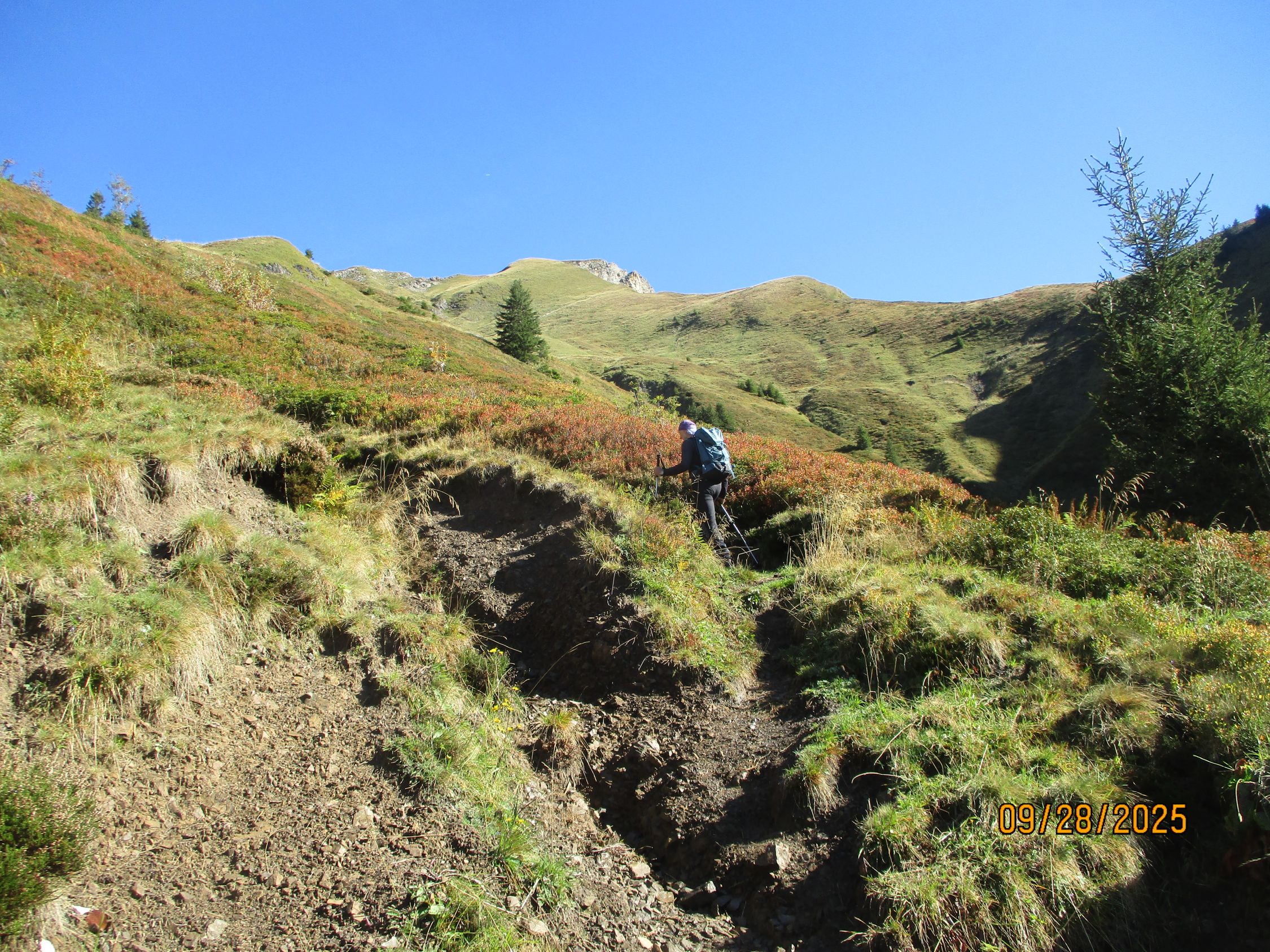 Prächtiges Herbstwetter. Wundervolle Kontraste der Herbstfarben der Umgebung mit den frisch angeschneiten Gipfeln in der Ferne.