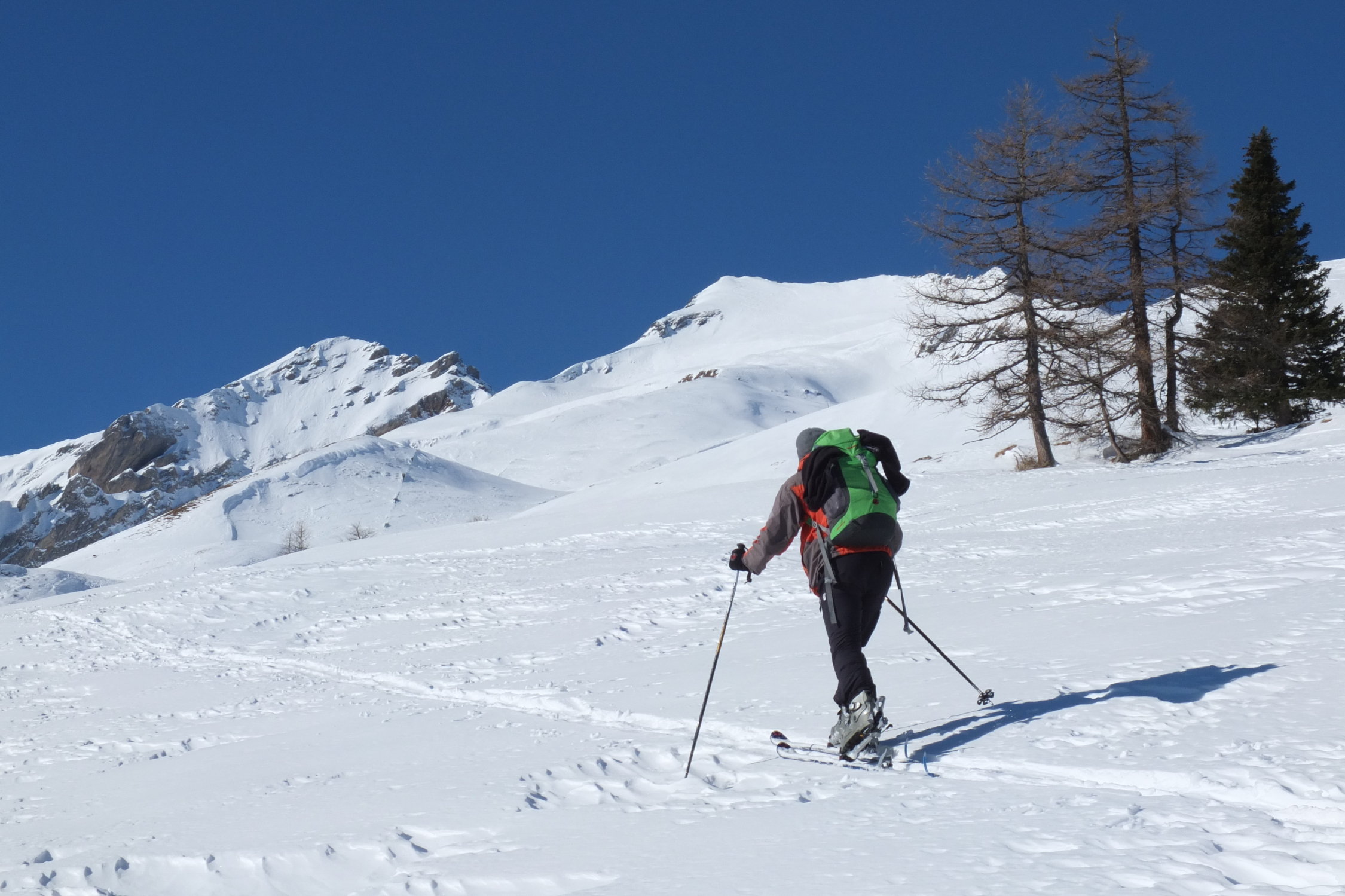 für den steilen, hart gefrorenen Gipfelhang sind Harscheisen mitzunehmen