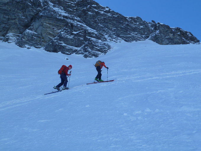 Von Fildrich bis Gipfel Landvogtehore 2Std.45. Nach Abfahrt in Steibode auf 1700 m Höhe nochmals Felle montiert und durch NW-Couloir nordöstlich unterhalb des Gipfels aufgestiegen bis Lücke 2320 m. Traumhafte Abfahrt durch dieses Couloir bis Steibode.