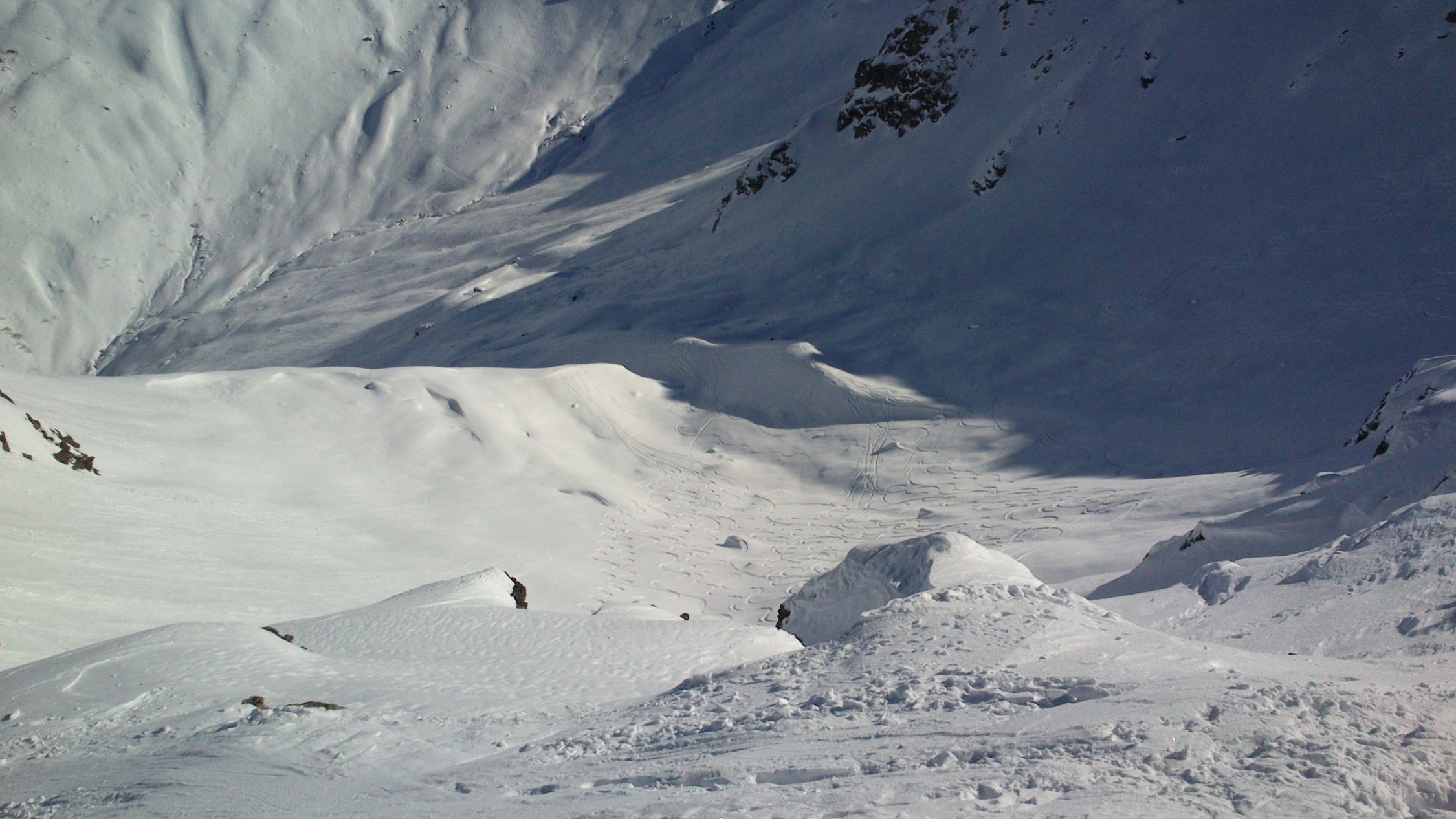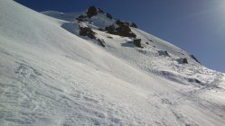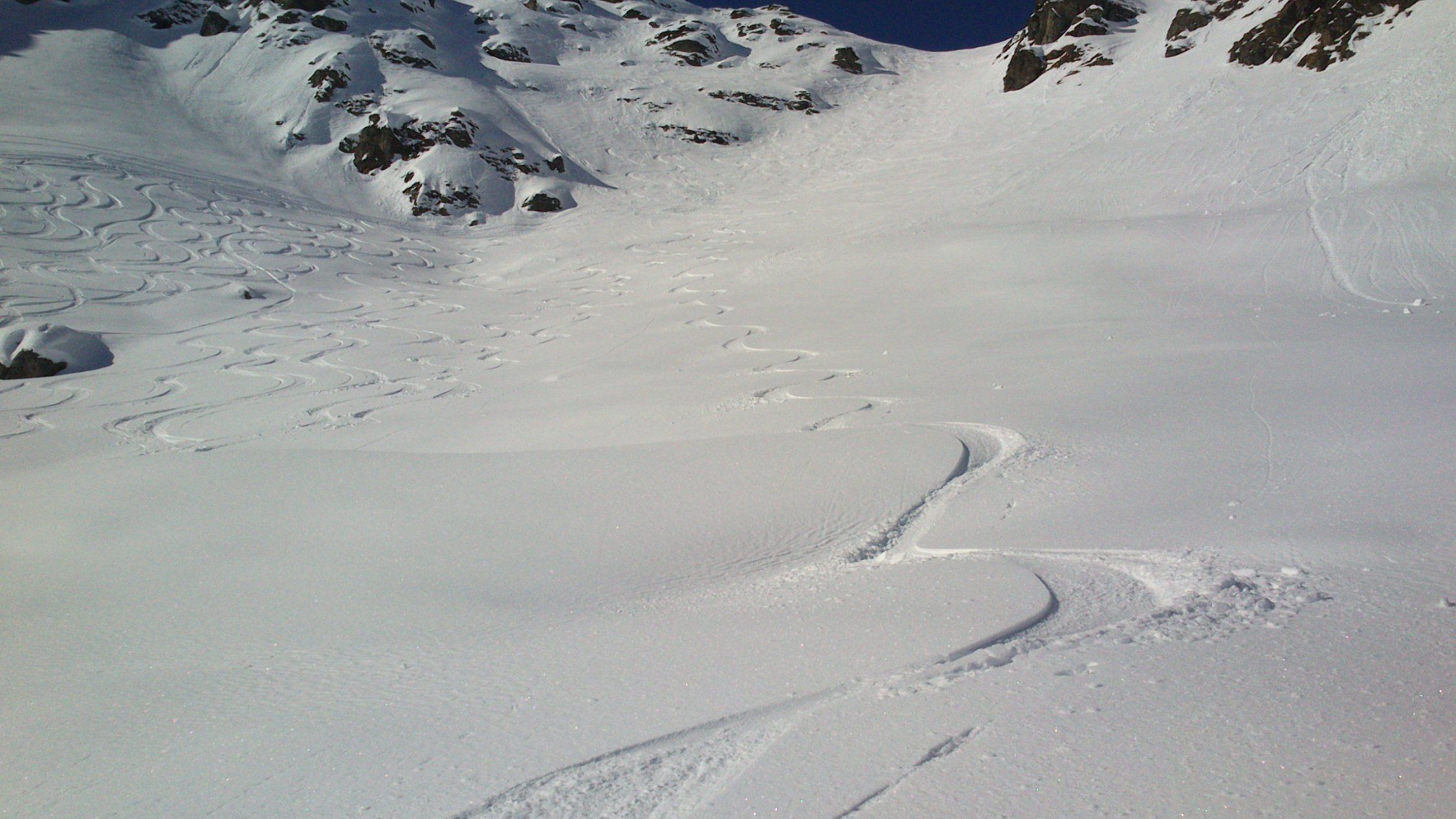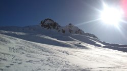 Noch wenig Windeinfluß, daher in schattseitigen Lagen noch passable Pulververhältnisse, speziell in der Ostrinne vom Gipfel tiptop. Nach der doch schon längeren Schönwetterperiode natürlich schon viel verspurt, aber es findet sich immer noch Platz.