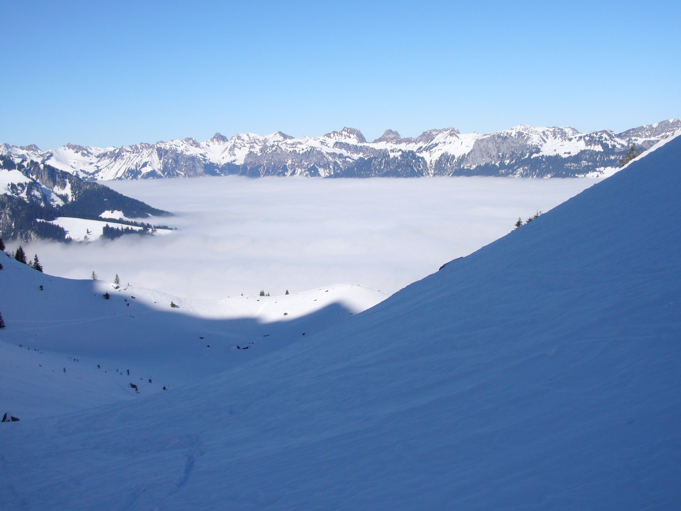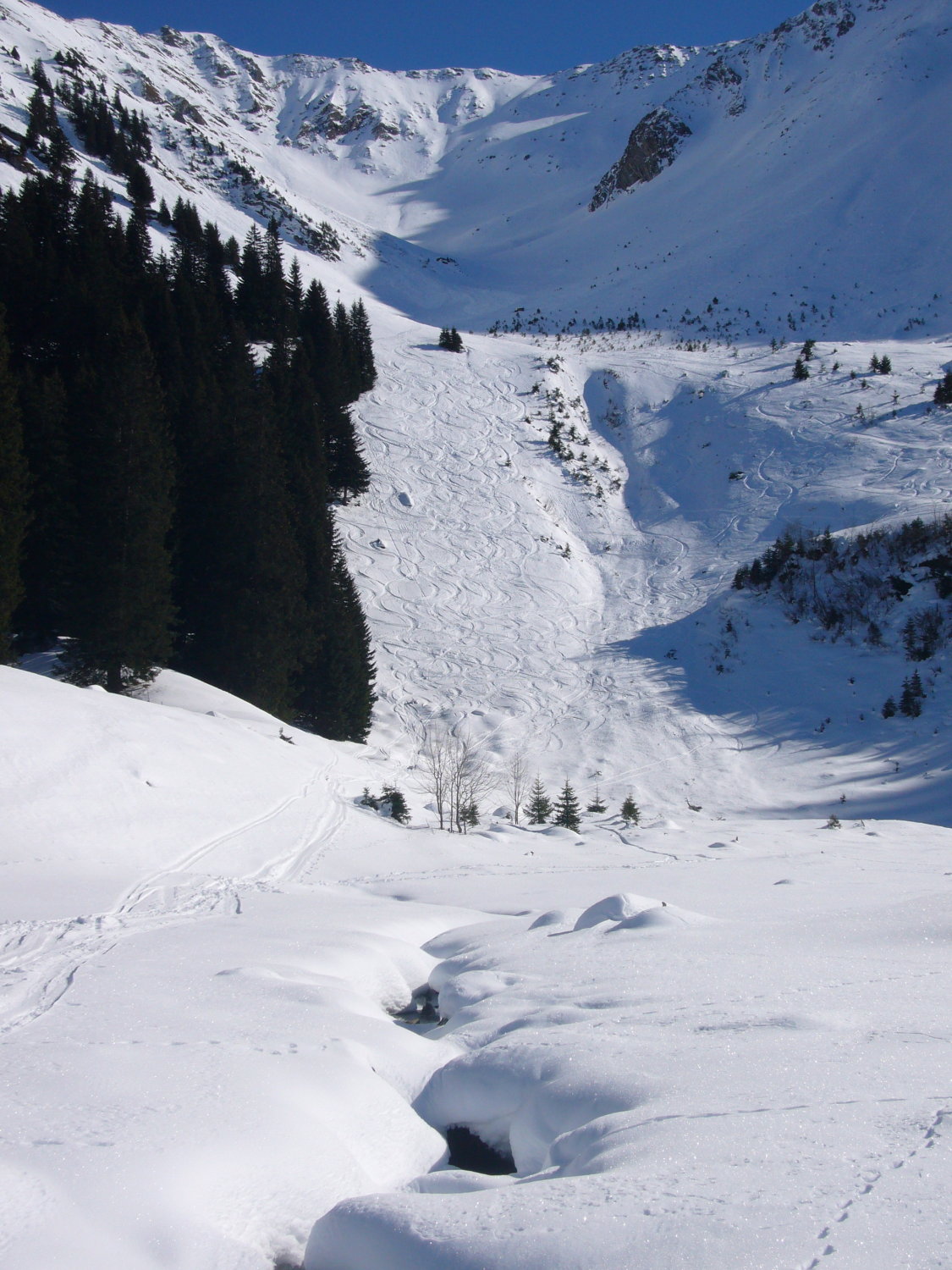 Im Aufstieg frühlingshaft, tendentiell steile aber gute Aufstiegspur. In der Abfahrt im Nitzel noch einige (Press-)Pulverreste gefunden.