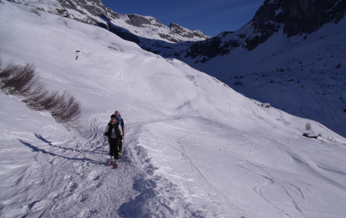 Beste Tourenverhältnisse. Schönes Wetter, etwas wenig Schnee aber stabile und sichere Verhältnisse. Beim Einsteig ins Gemschtobel könnten Steigeisen und ein kurzes Seil gute Dienste leisten. Ansonsten eine gute und angenehme Spur. In der Abfahrt, bei weichem Schnee, können sichere Tourenfahrer die Ski anbehalten.