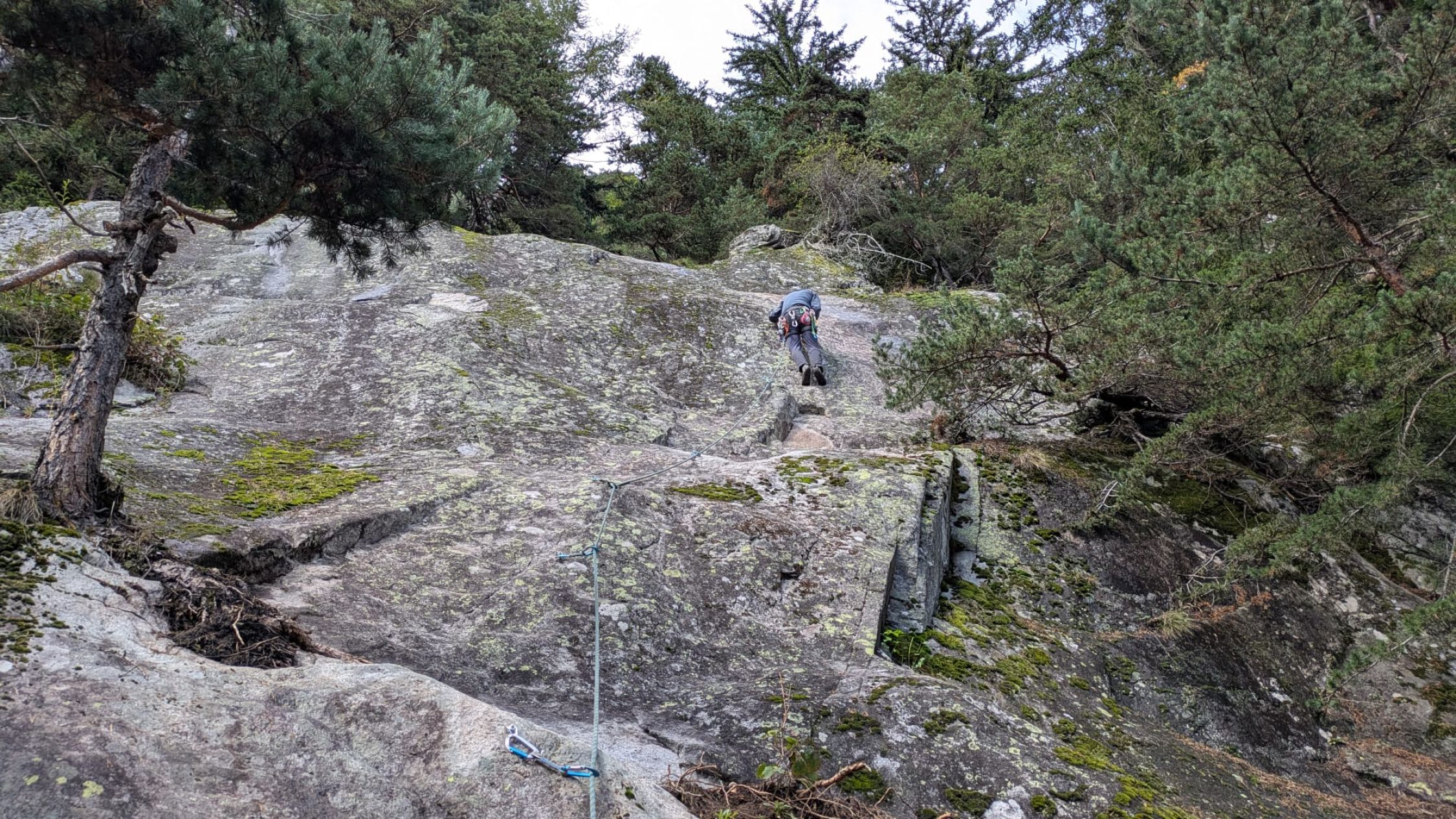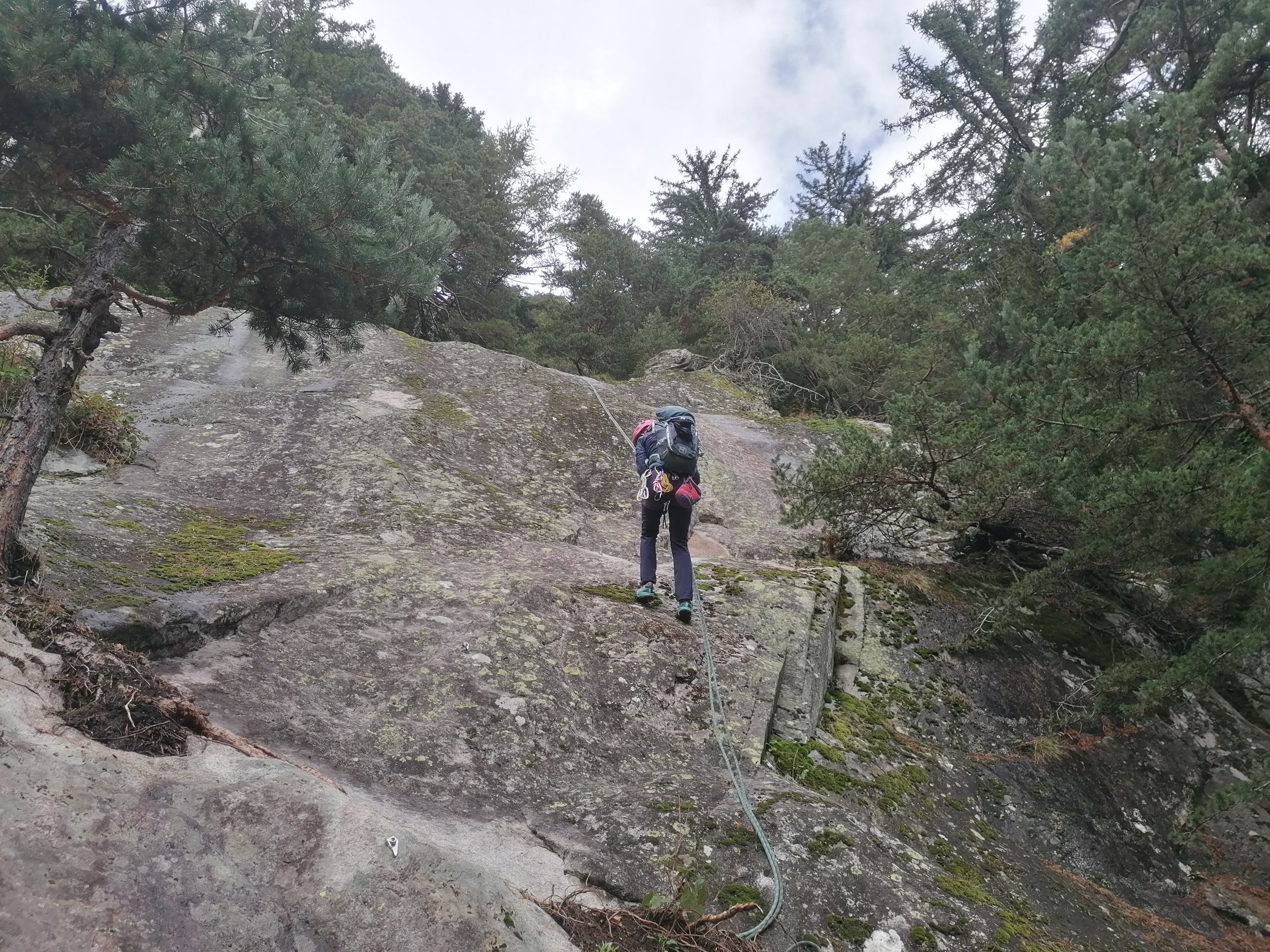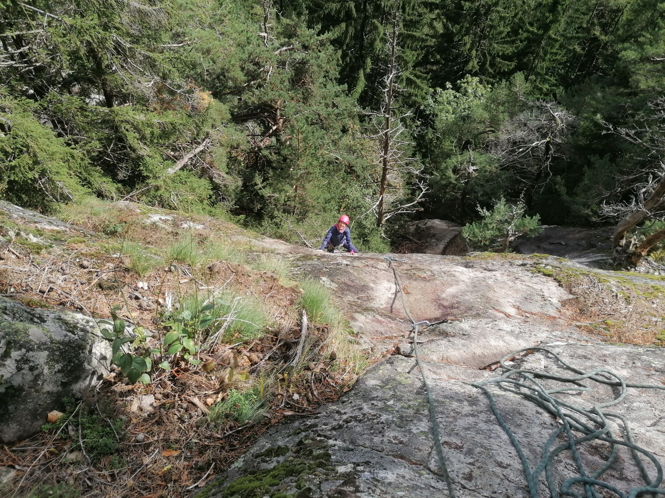 Wunderbare Gneis Kletterei beim lieblichen Bergdorf Les Granges in der Gorges du Dailley. Wir waren im Sektor Dalle des Dames, und haben die grossartige Kletterroute Belle Helene mit 6 Seillängen, und die neue Einstiegsvariante gemacht. Die Route ist 160m lang, im Schwierigkeitsgrad 5b bis 6a, und ausgezeichnet abgesichert. Der Abstieg erfolgt mittels abseilen, oder durch die wunderschöne Gorges du Dailley zurück nach Granges.