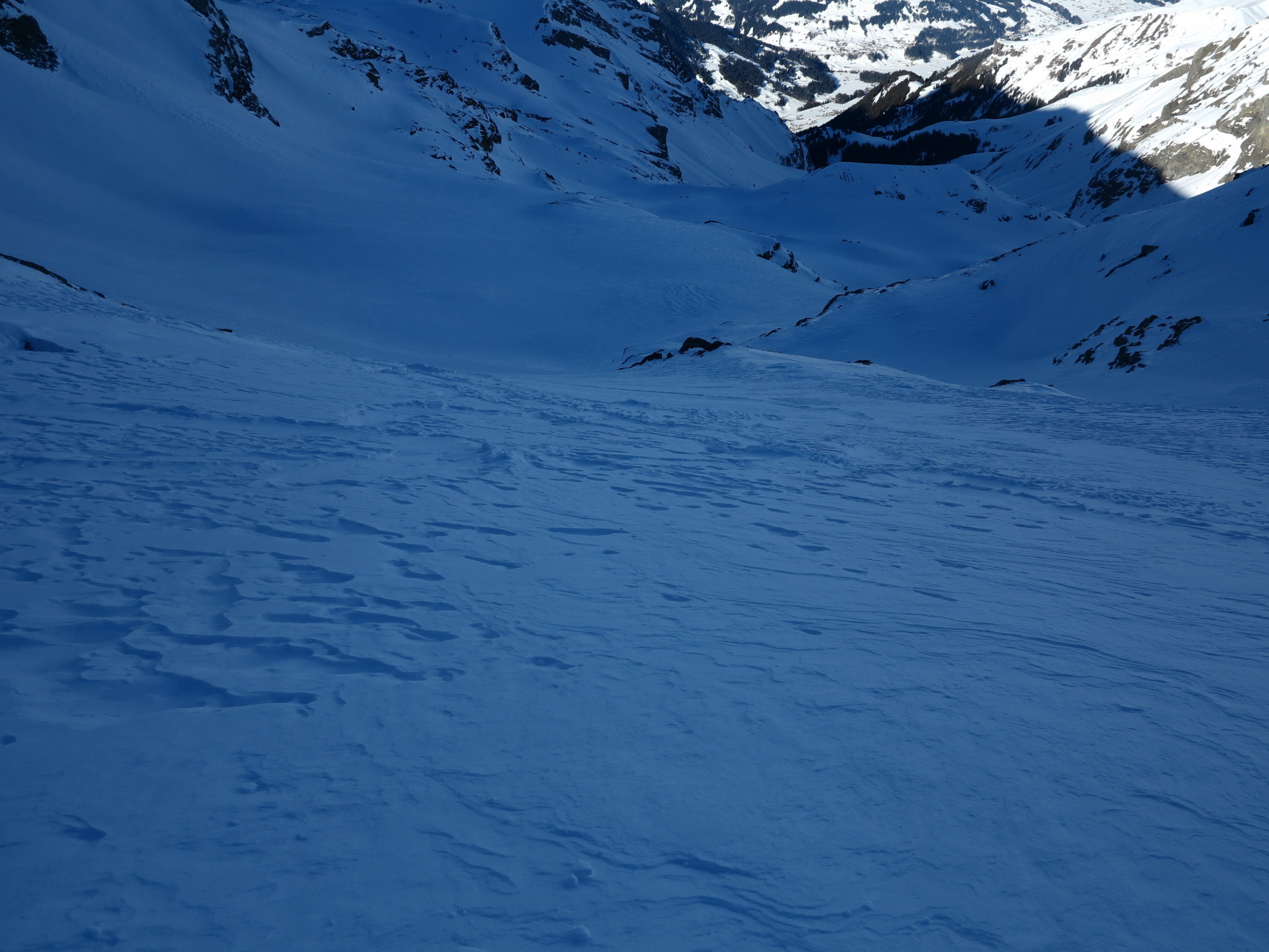 Danach hat der Wind den Pulverschnee arg verfrachtet. Die abgeblasenen, tragenden Stellen erkennte man jedoch sehr gut. Zwar kein Pulver aber auch sehr schön zum fahren.