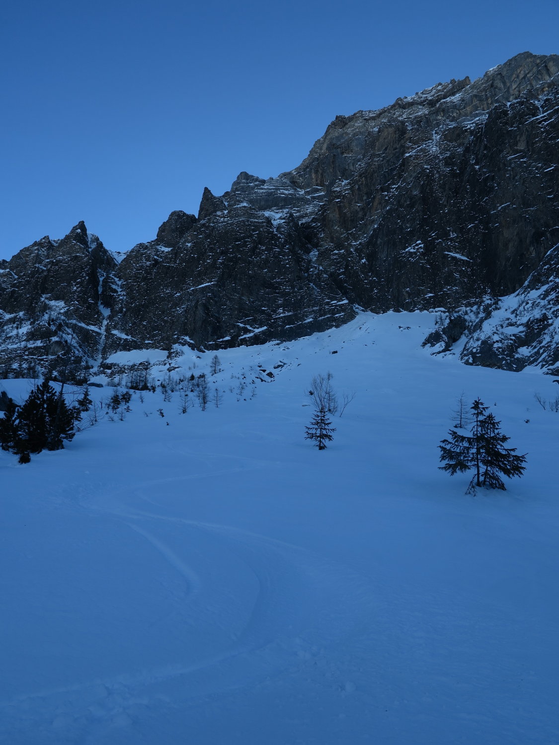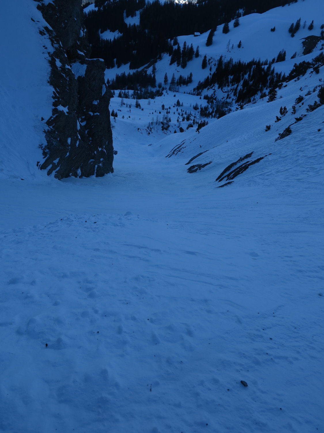 Nach Ammerten Schafberg umbedingt auf der südlichen Seite des Baches bleiben. Die Enge Passage hinunter und möglichst schnell nach westen traversieren, oberhalb des ersten Waldstückes! Nun zwischen den beiden Waldstücken in sehr schönem Pulver nach Ammerte P. 1506m. Dort zwingend den Bach auf dem Wanderweg überqueren und wie oben beschrieben nach Hotel Simmenfälle.