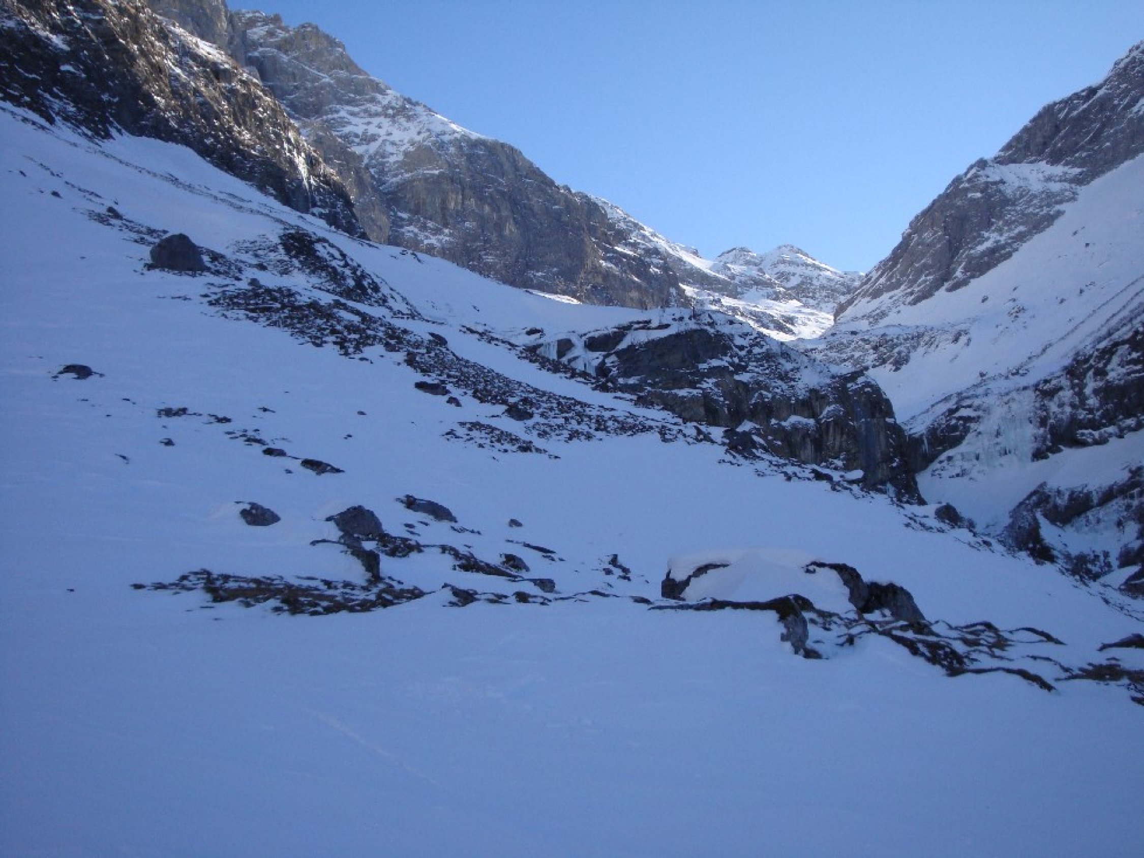 Oberhalb Häxensee gute Bedingungen, darunter lausiger Harstdeckel und unterhalb Oberstafel sehr wenig Schnee. Föhn hat ganze Arbeit geleistet.