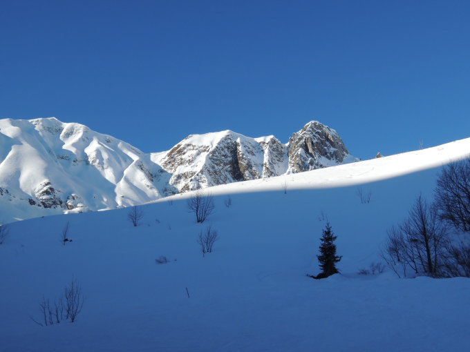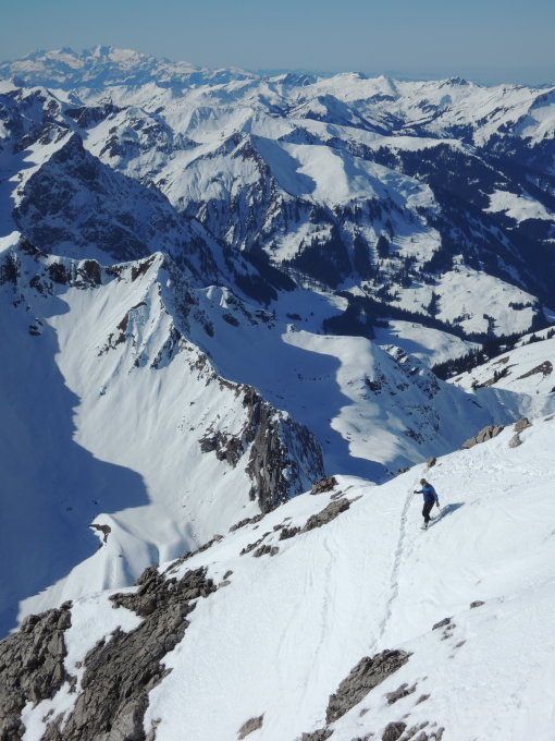 Tip top. Man kann vom Gipfel bis zum Parkplatz durchfahren. Keine Lawinenbollen in der Gipfelrinne und daher gut zu fahren. Zwischendurch traumhaftes Skigelände