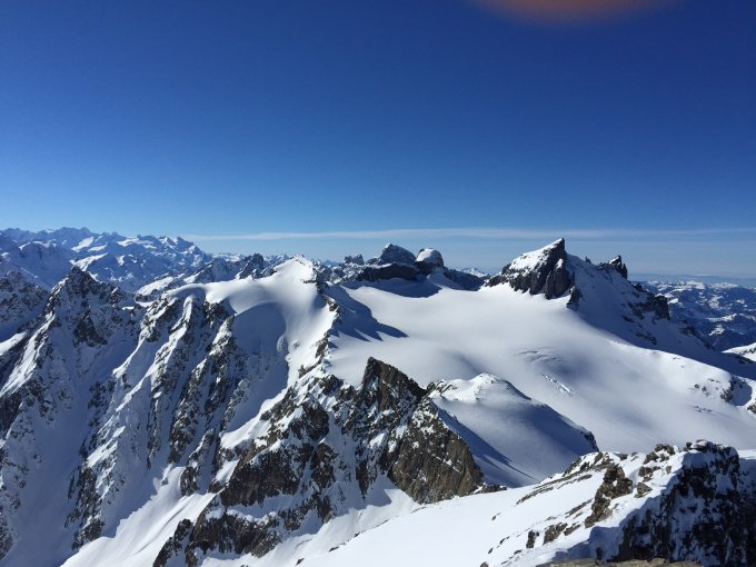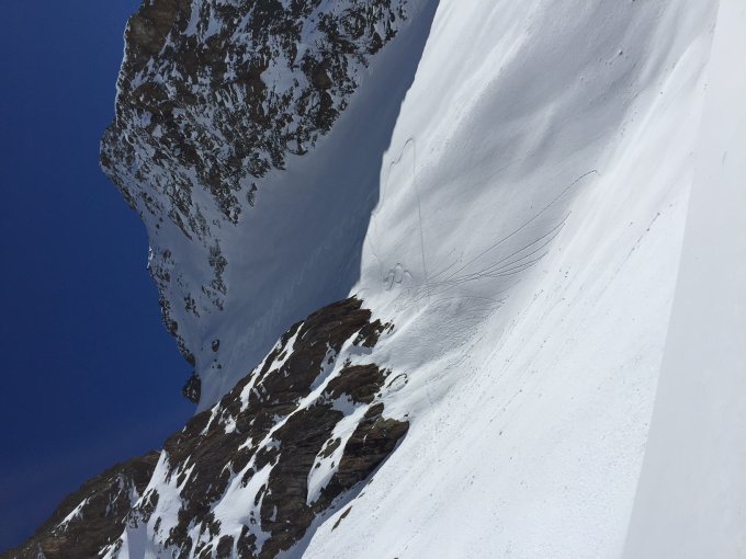 Bis in den Saaspass gute Spur. Danke an meine unbekannten Vorgänger. Schöne Abfahrt auf der Rückseite. Siehe Bild. Danach problemlos in die Krōntenlücke. Weiter mit Ski auf den Grat. Letztes Stueck zu Fuß bis auf den westlichen Turm. Abfahrt ins Erstfeldertal. Meistens windverblasen und mäßig zum Abfahren aber geniales Ambiente. Man kommt mit den Skis bis ca. 720hm. Danach ist Laufen angesagt bis Erstfeld.