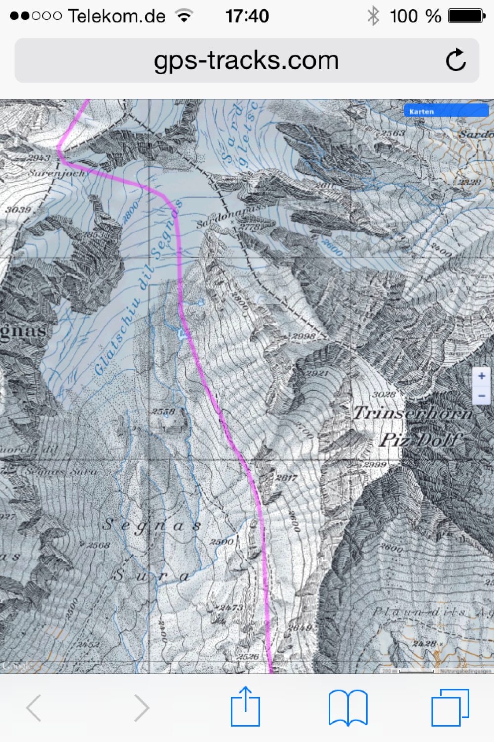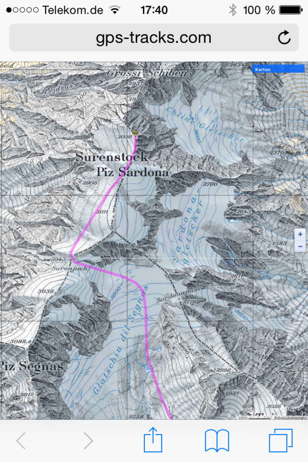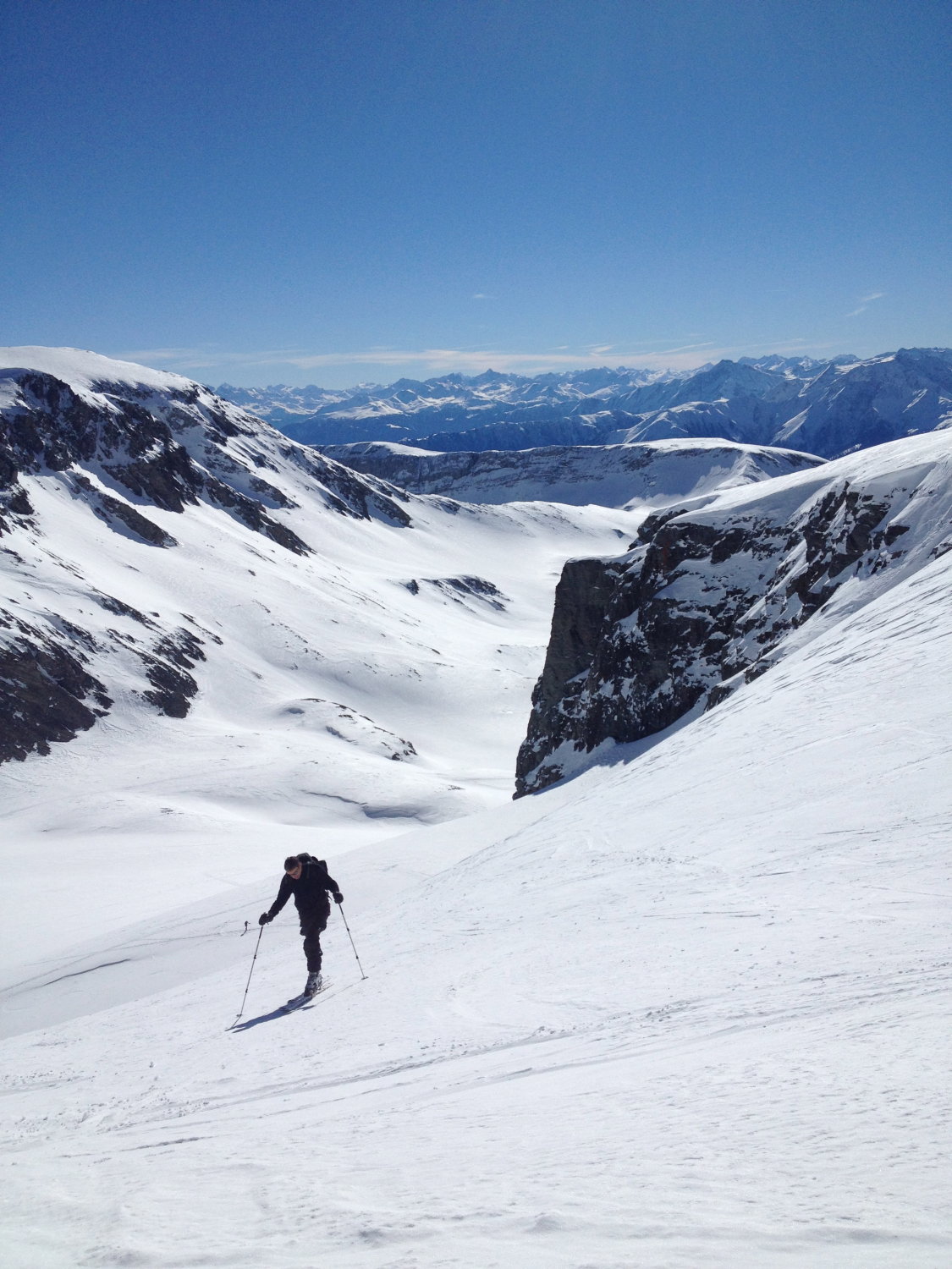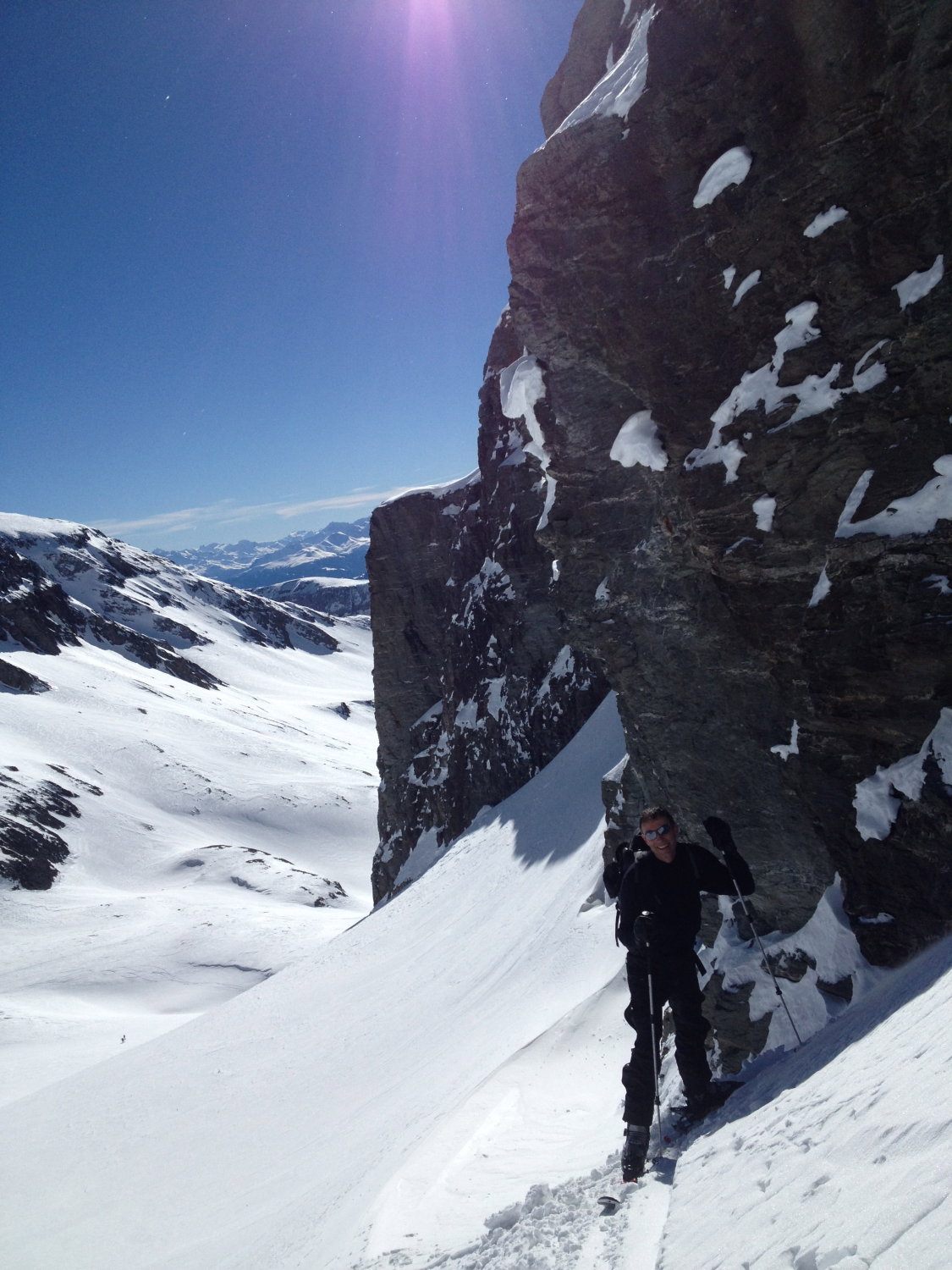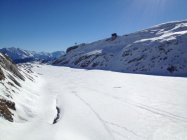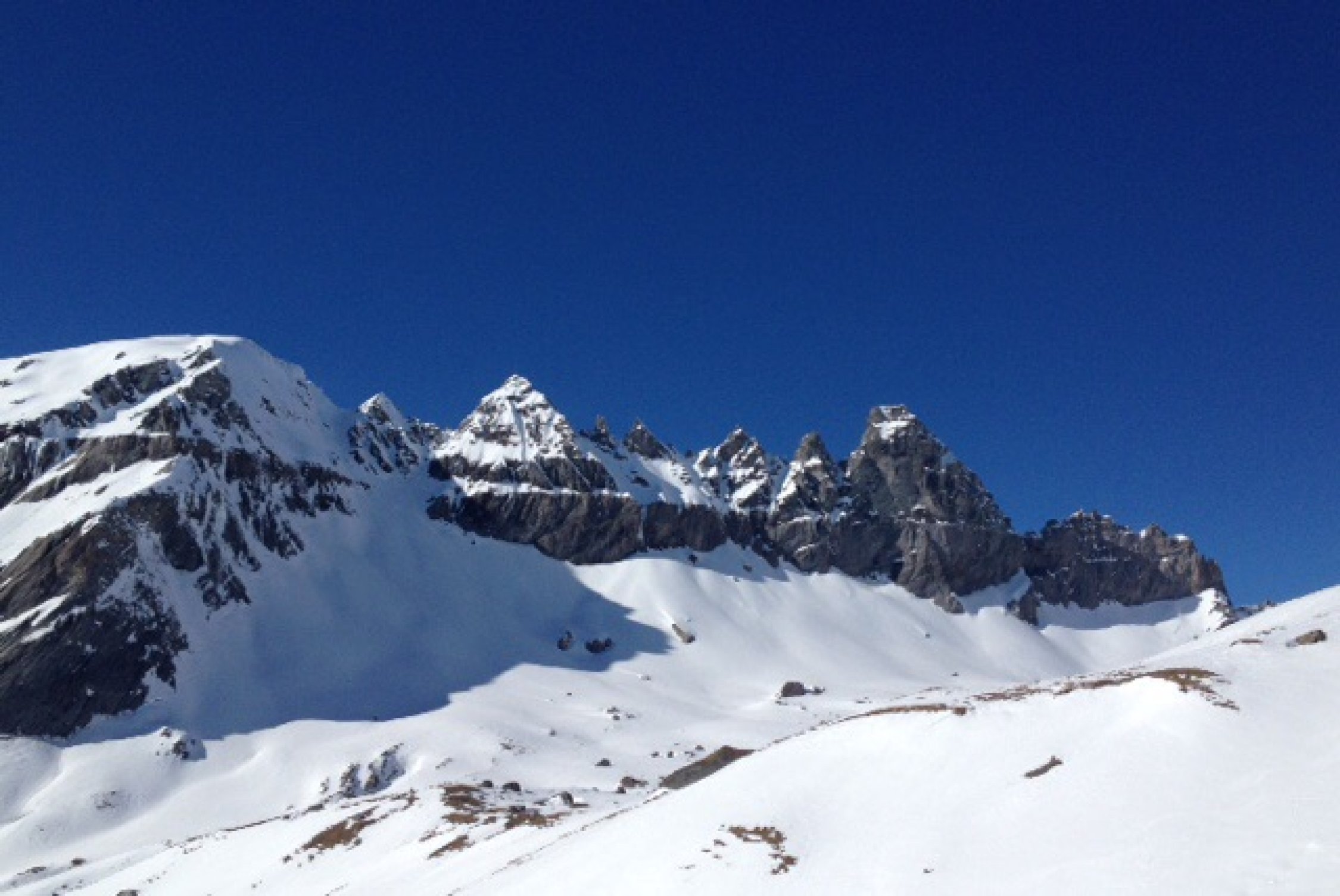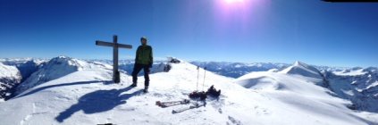 Wenig Schnee, überwiegend hart, aber dennoch gut zu fahren. Für den Aufstieg zum Surenjoch empfehlen sich Harscheisen.