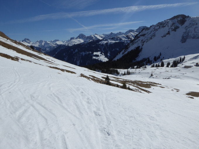 bis nach der Edelweisshütte ausreichend Schnee, die steilen Hänge zum Sattel dann schon recht dünne Schneeauflage, genauso auf dem Rücken zum Gipfel; Abfahrt direkt vom Gipfel über schöne Hänge, allerdings unten dann noch Querung mit Skitragen über ausgeaperte Stufe