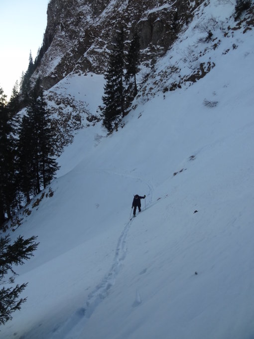 Bis zur Alp Gschwänd sind viele Spuren von Skifahrern und Schneeschuhläufern vorhanden. Nachher haben wir heute alles neu eingespurt. Das Couloir hoch nach Treichen ist sehr steil und häufig von einer griesigen Schneeschicht bedeckt, was die Angelegenheit entsprechend rutschig gestaltete. In der Traverse zum Nauen sind mehrere steile Gräben zu queren. Aufgrund der Rutschigkeit des Schnees haben wir diesen Abschnitt zu Fuss zurückgelegt. Im Nauen selbst dann sehr guter Presspulver, angenehm um mit Skis aufzusteigen. Nur die letzten 20 m der steilen Traverse zur Klimsenkapelle nochmals zu Fuss.
