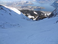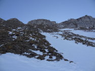 In der Gipfelflanke liegt sehr wenig Schnee. Daher hier alles mit aufgebundenen Skis zu Fuss entlang dem Sommerwanderweg aufgestiegen - geht gut. In der Abfahrt können die Gräben benutzt werden und die Flanke ist fast durchgängig befahrbar. Während mein Kollege von ganz oben abgefahren ist (eine Stelle sehr schmal und kaum Schnee) habe ich meine Skis einige Meter weiter unten deponiert. Die Ausgesetztzeit in dieser Flanke darf nicht unterschätzt werden - ein Sturz hier würde unter Umständen erst wieder in der Alp Ober Lauelen (600 Hm tiefer) zum Stillstand kommen.