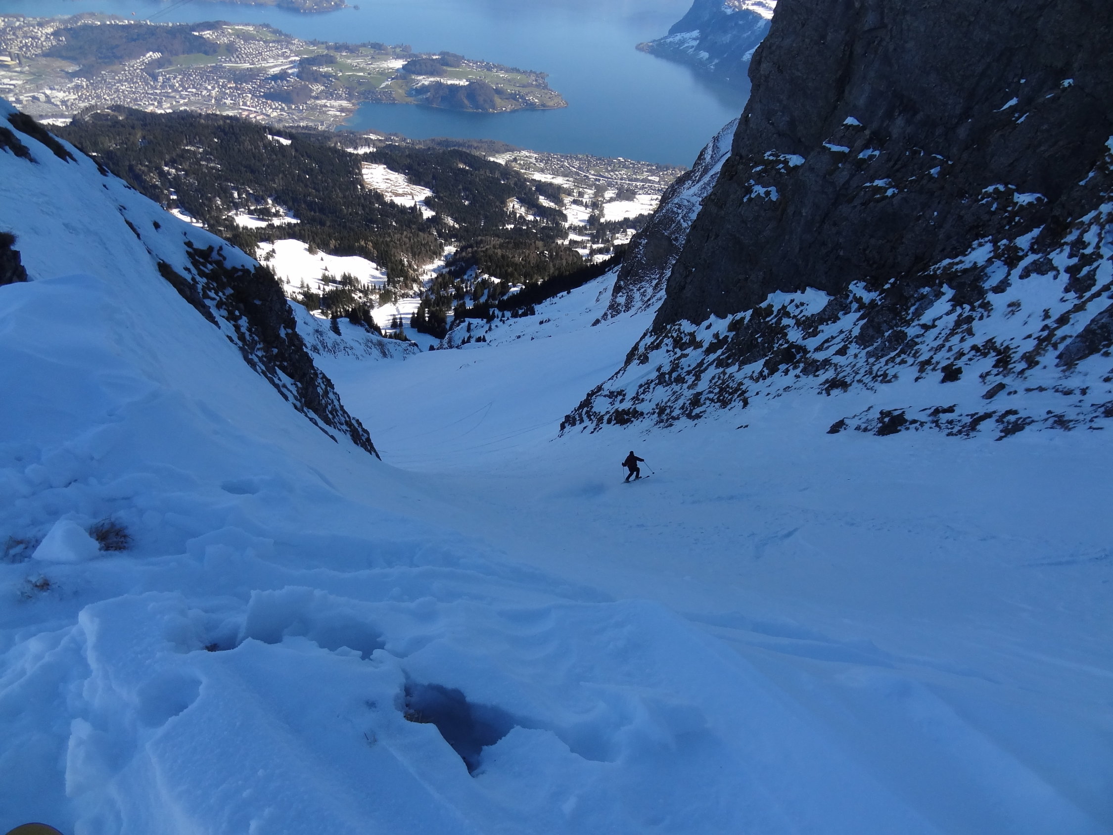 In den Nauen sind wir dann etwas höher als die Kapelle in ein Couloir eingefahren. Hier ist die Einfahrt etwas flacher und das Couloir gut eingeschneit. Im Nauen sehr schöner Presspulver und auch für die weitere Abfahrt bis nach Hergiswil sehr gut.