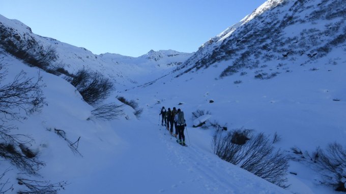 Wir berieten des längeren, ob wir Richtung Tübingerhütte abfahren sollen (Treibschnee etc.) Die Spuren, die wir weiter unten sahen, stimmten uns zuversichtlich, sodass wir einzeln anfuhren. Nur im gekräuselten Pulverschnee war entspanntes und 'juchzendes' Abfahren möglich. An glatten Stellen verriss einem der plattige Schnee gerne die Schi. Danach wartete der Anstieg auf das Hinterbergjoch. Man ist schon etwas müde und somit mutet alles noch weiter und steiler an, was es in Wirklichkeit ohnedies ist. Die Fahrt zum Vergaldatal hinaus war mit Ausnahme kurzer Stecken eher ein notweniges Übel. Gegen 18:10 Uhr waren wir von der 11-stündigen Tour etwas müde aber voller Freude zurück.
