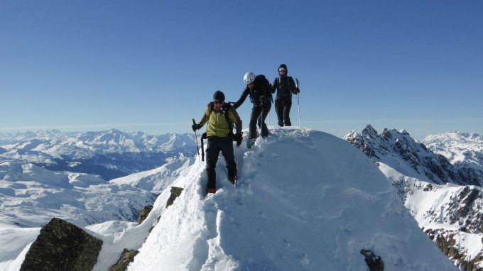 Wir hatten Bilderbuchwetter - gleißend heiterer Himmel und wenig Wind. Da vergisst man bald den langen und empfindlich kalten Anstieg durch das Vergaldatal. In sorgsam vorsichtigen Schwüngen ('Eiertanz') ging es auf den bereits angefirnten Hängen auf Schweizer Gebiet hinunter. Es ist alles weiträumig und ruhig. Am Südgrat wird die Felsstufe mit abgeschnallten Schiern in leichter Blockkletterei überwunden. In weiterer Folge ging es aussetzt auf Schiern Richtung Gipfel. Die Verhältnisse müssen passen, um vom Schidepot den Gipfelgrat zu überwinden. Bei uns hat es gepasst :-)