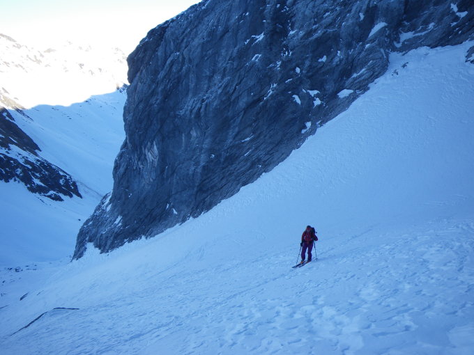 Durch die ganze Blodigrinne guter Schnee zum gehen, aber Harscheisen sind schon ratsam. Schnee zum Abfahren glatt und griffig. Aber trotzdem nichts für Anfänger!!!
