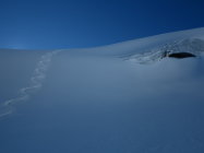 In der Abfahrt ungefähr entlang der Aufstiegsroute bis auf den Steghorngletscher. Danach in der Aufstiegsspur abfahren, nicht in den Graben nach dem Steghorngletscher, möglichst nahe unterhalb von den Felsen des Lämmerenhorn 609'754.7, 139'233.3. Nun den West-Hang hinunter in die Aufstiegsspur.