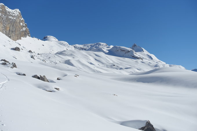 Auf der Nord- und Nordwestseite der Barglen-Schiben deuteten vor 1 - 2 Tagen spontan abgegangene Schneebretter darauf hin, dass auch auf dieser Route bei Stufe 3 die nötige Vorsicht und vorsichtige Roitenwahl angebracht ist.