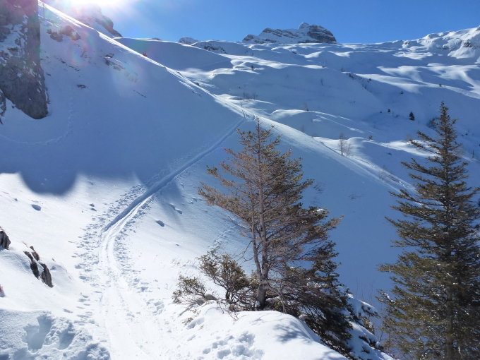 Am frühen Morgen wurde auch die z.T. ebenfalls steile SW-Flanke befahren. Da wird aber - wie in allen Sonnenhängen - rasch ein Deckel entstehen.