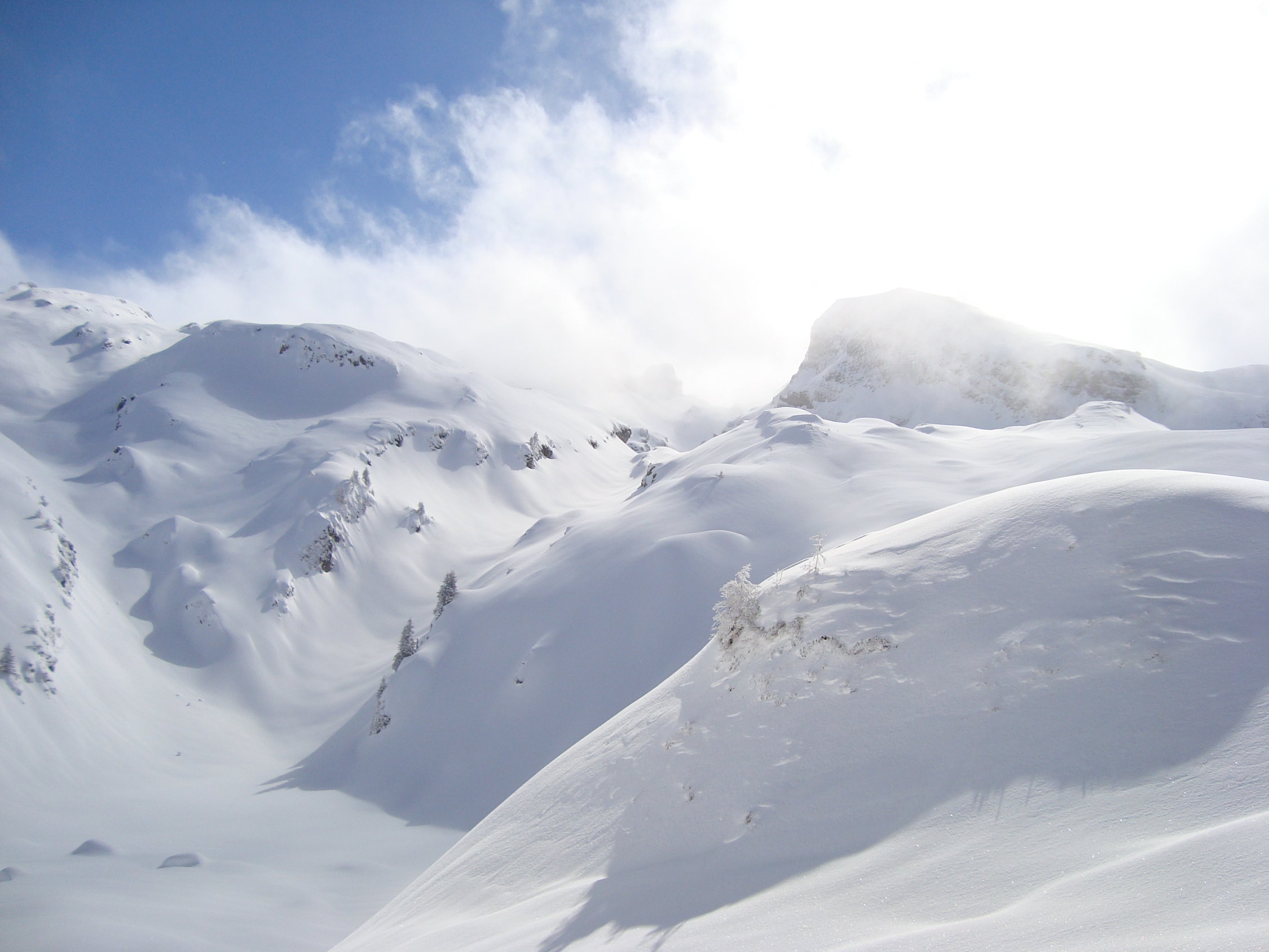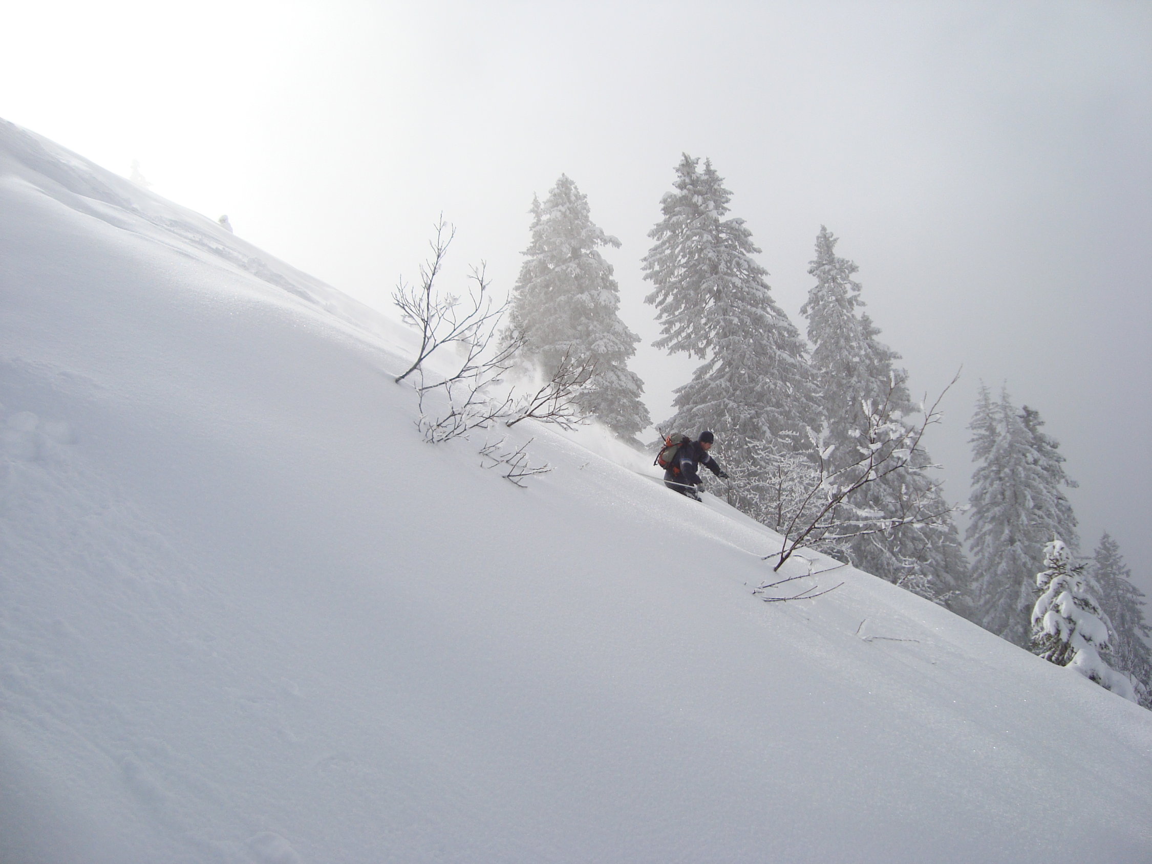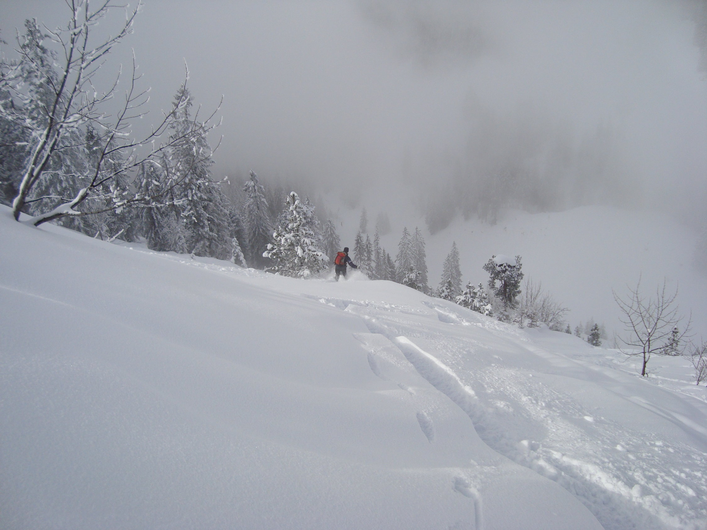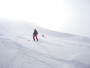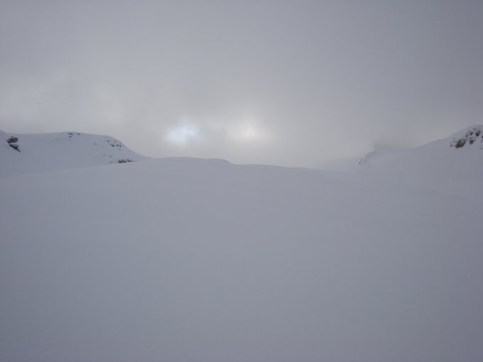 Im Aufstieg zum grössten Teil diffuses Licht mit ein paar zaghaften Aufhellungen. Die Neuschneehöhe liegt zwischen 15 bis 30cm.