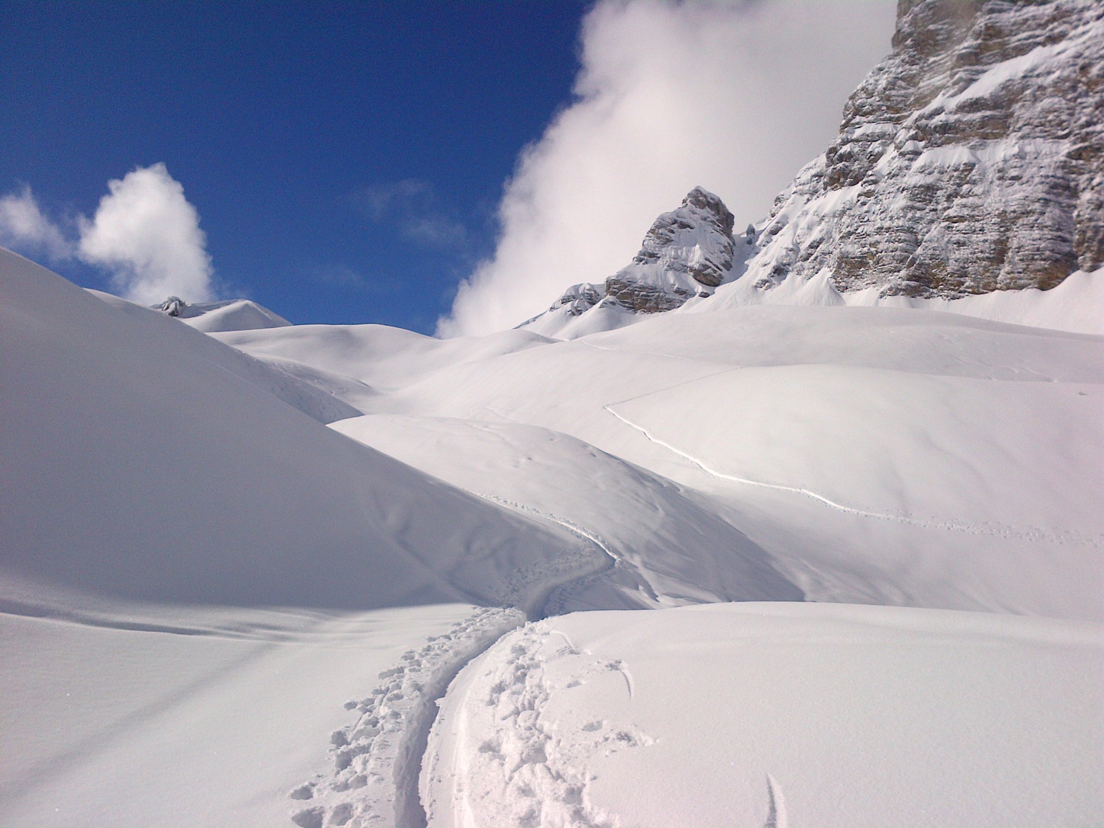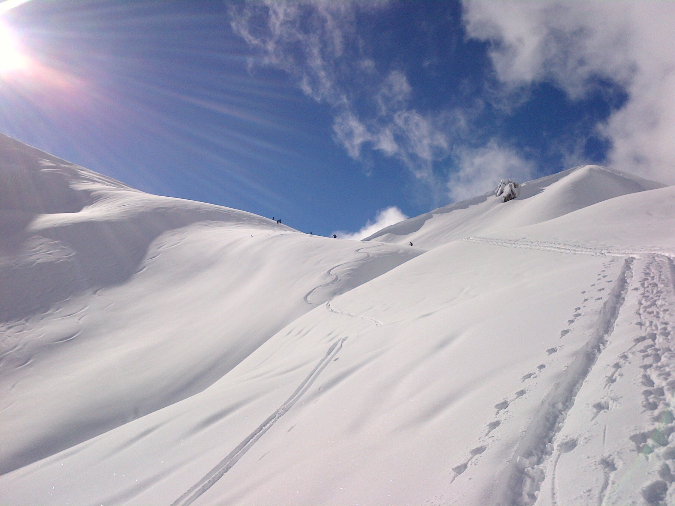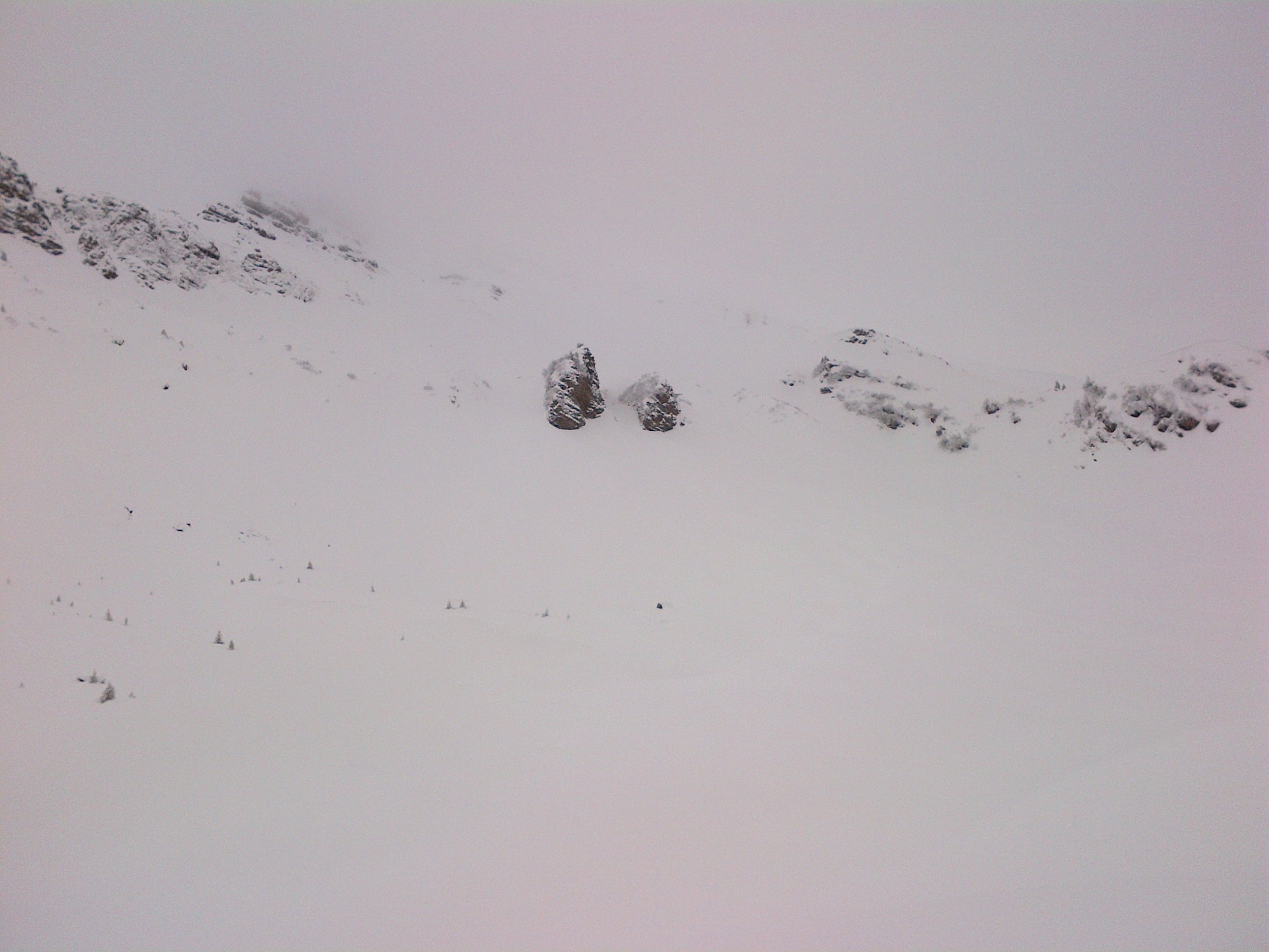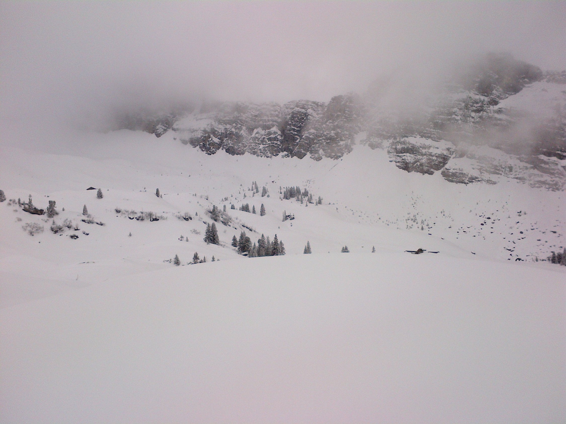 Schnee super und gut zu fahren. Zuerst einmal abgefahren über Grimmifurggi auf 1900 m dann wieder rauf und über die Wächte in die Nordabfahrt eingefahren. Sicht war zwar mäßig und deshalb das Fahren auch nicht sehr flüssig, dafür war der Hang leer, denn es hatte sehr viele Leute heute (auch wenn es auf den Bildern nicht so aussieht).
