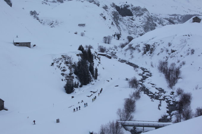 Fluffiger windfrei gefallener Neuschnee, im unteren Teil der Abfahrt stört der darunter liegende zerfahrene harte Altschnee etwas.