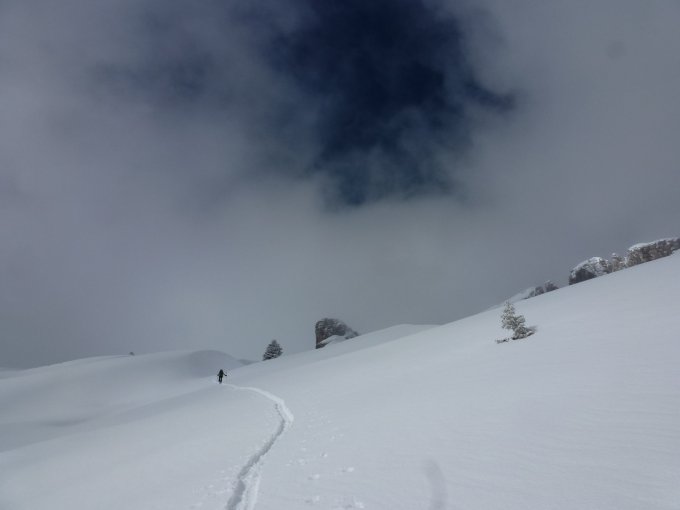 Schnee: Zwischen 5 und rund 40 cm Neuschnee, je nach Meereshöhe. Leicht angefeuchtet, aber sehr schön zu Befahren. Oberhalb Bodenhütten (Abzweigung der Route zum Hängst, P. 1436) nur einzelne Spuren.