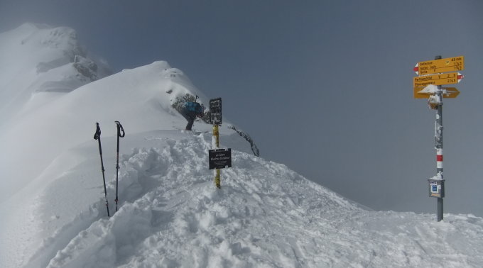 Nur bis zum Vorgipfel gelaufen. Der Grat war stark verwächtet. Mit der dicken unverfestigten Pulverschneeauflage an exponierten Stellen verspürte ich kein großes Verlangen danach ohne Sicherung. Es waren keine Spuren dorthin sichtbar.