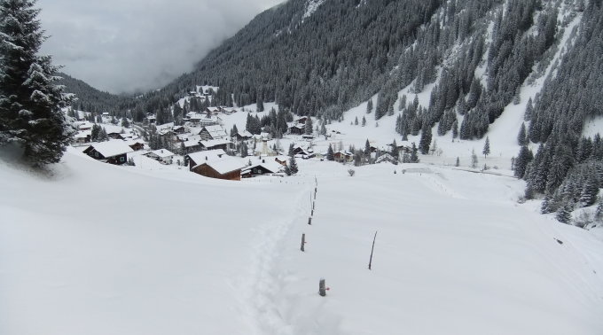 Im Abstieg wählte ich die Variante durchs Ronggbachtal. Ich ließ mich von frischer und älterer Abfahrtskispur verführen, die wohl vom Rotspitz kamen und auf südlicher (rechter) Bachseite hinab zogen. Ab dem Wald ging’s sehr rustikal cross country zu, bis man zum Röbi-Rüti-Waldweg stieß, welcher ebenfalls stark eingeschneit war. War und ist keine Empfehlung. Besser über die Ronggalpe auf anderer Bachseite absteigen.