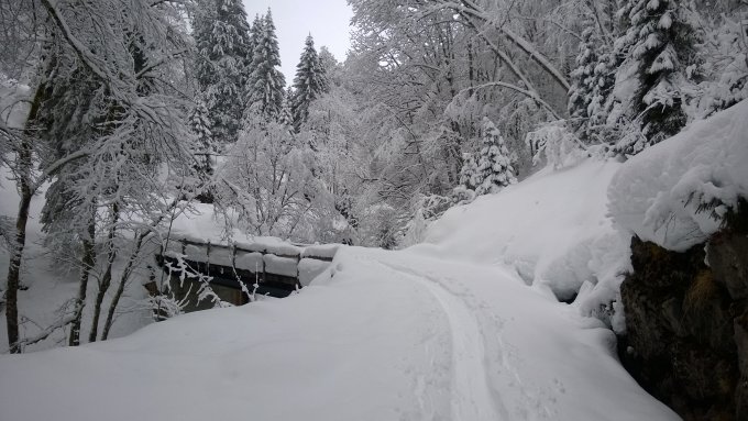 Neuschnee, Sicht im oberen Teil nicht ideal, bis zur Strasse mehr als genügend Schnee