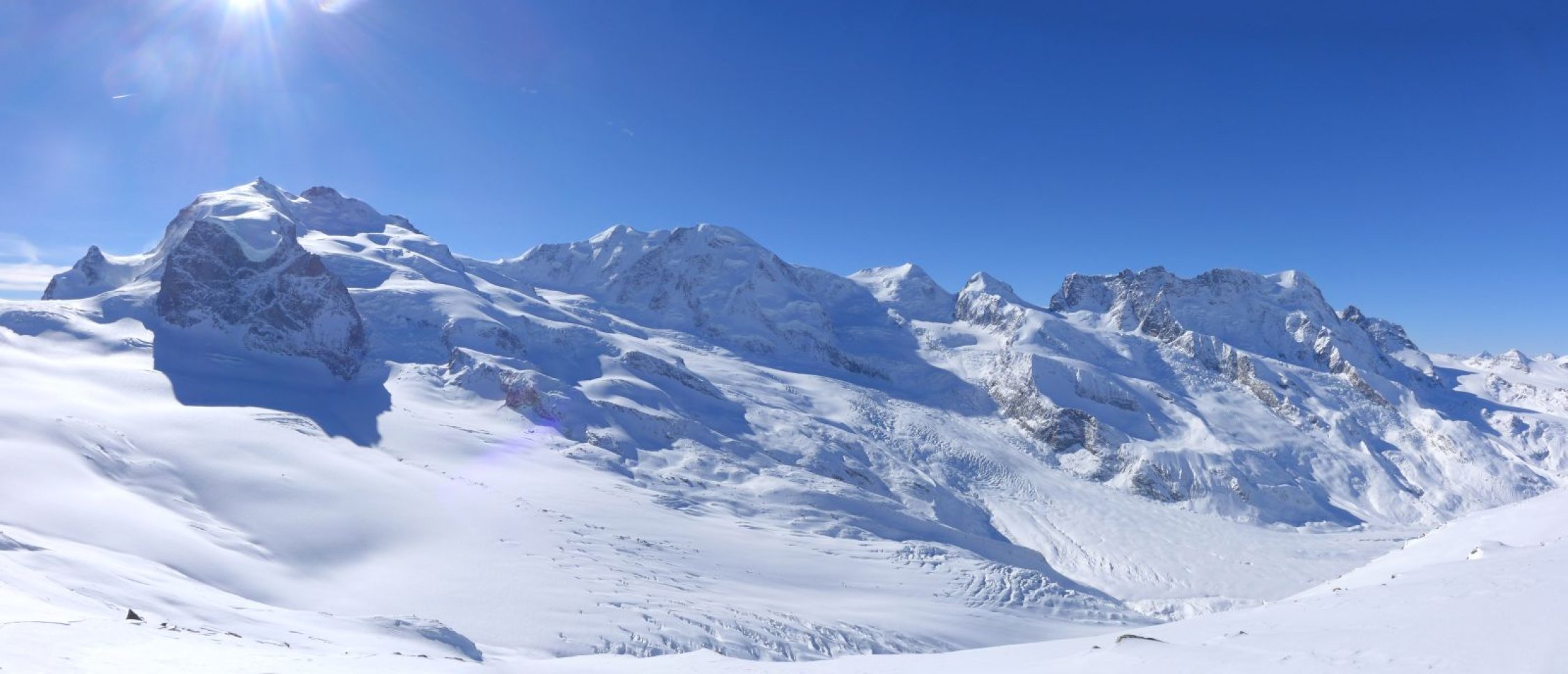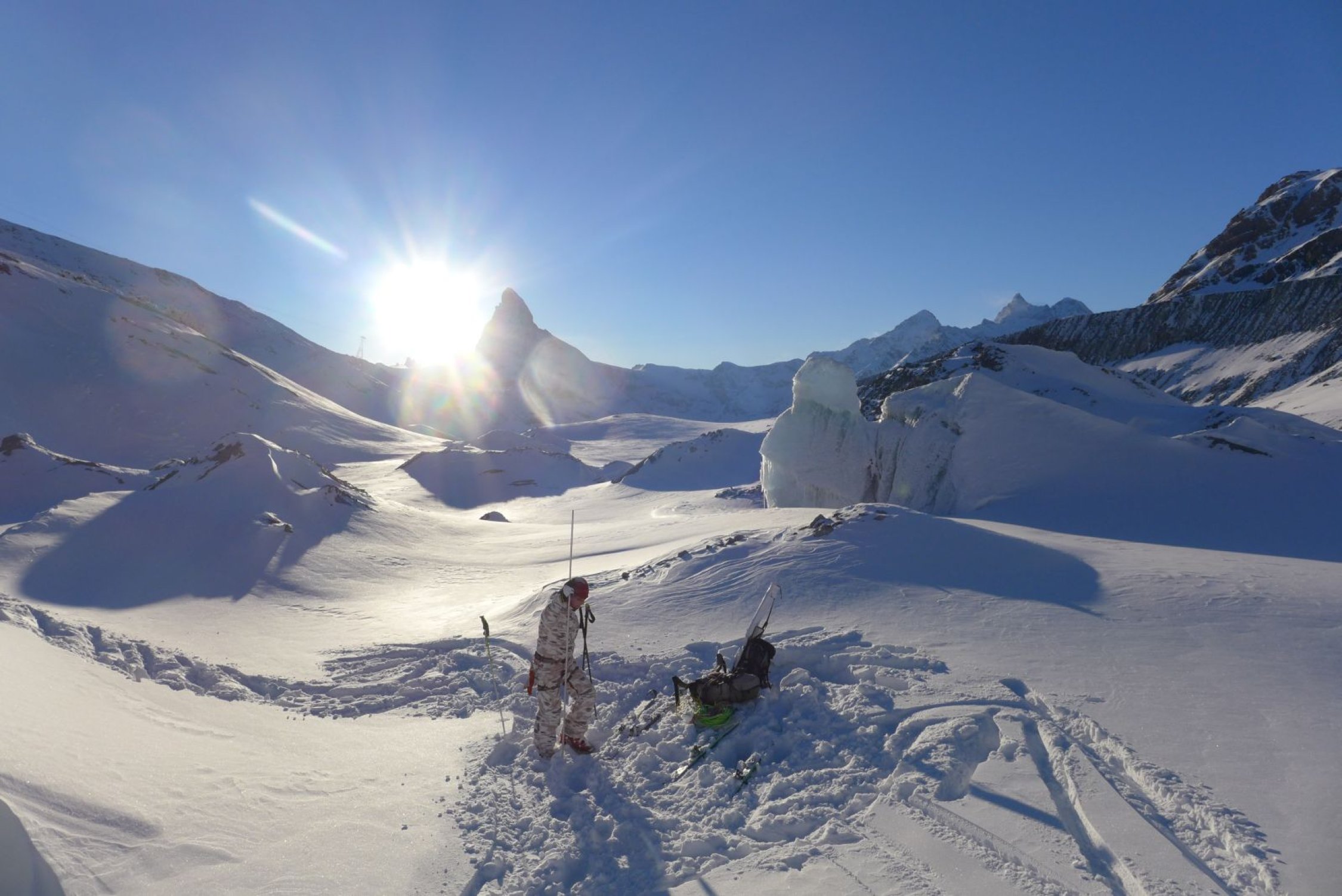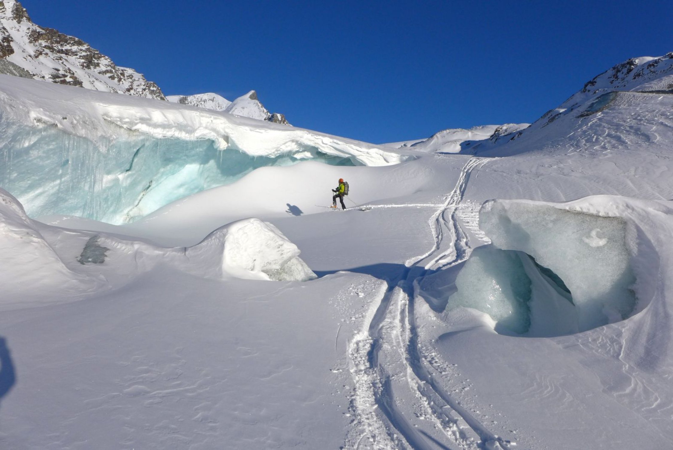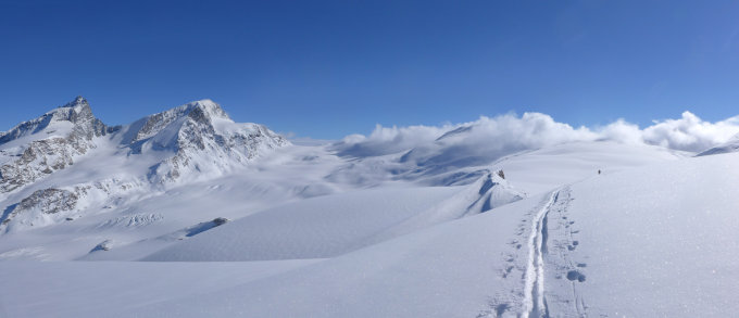 Abfahrt via Findelengletscher: Sobald man links die Riesenspalten auf ca. 3000m sehen kann, so weit nach rechts fahren, bis dort ebenfalls Randspalten sichtbar werden; Abfahrt in Fallinie bis zur Zunge. Das Gletschertor ist sehenswert!