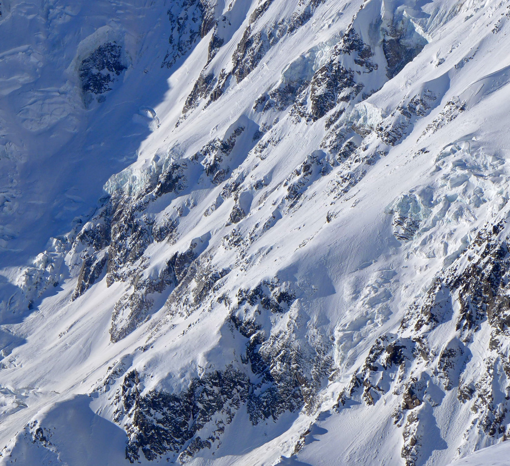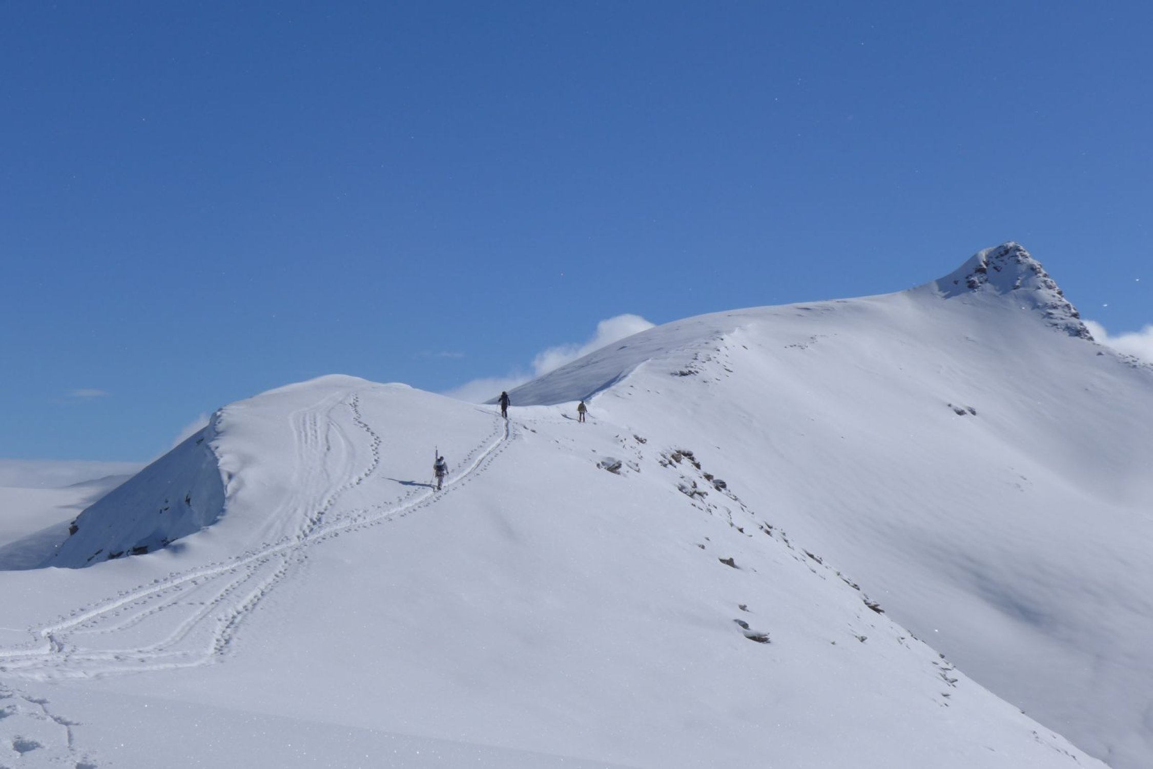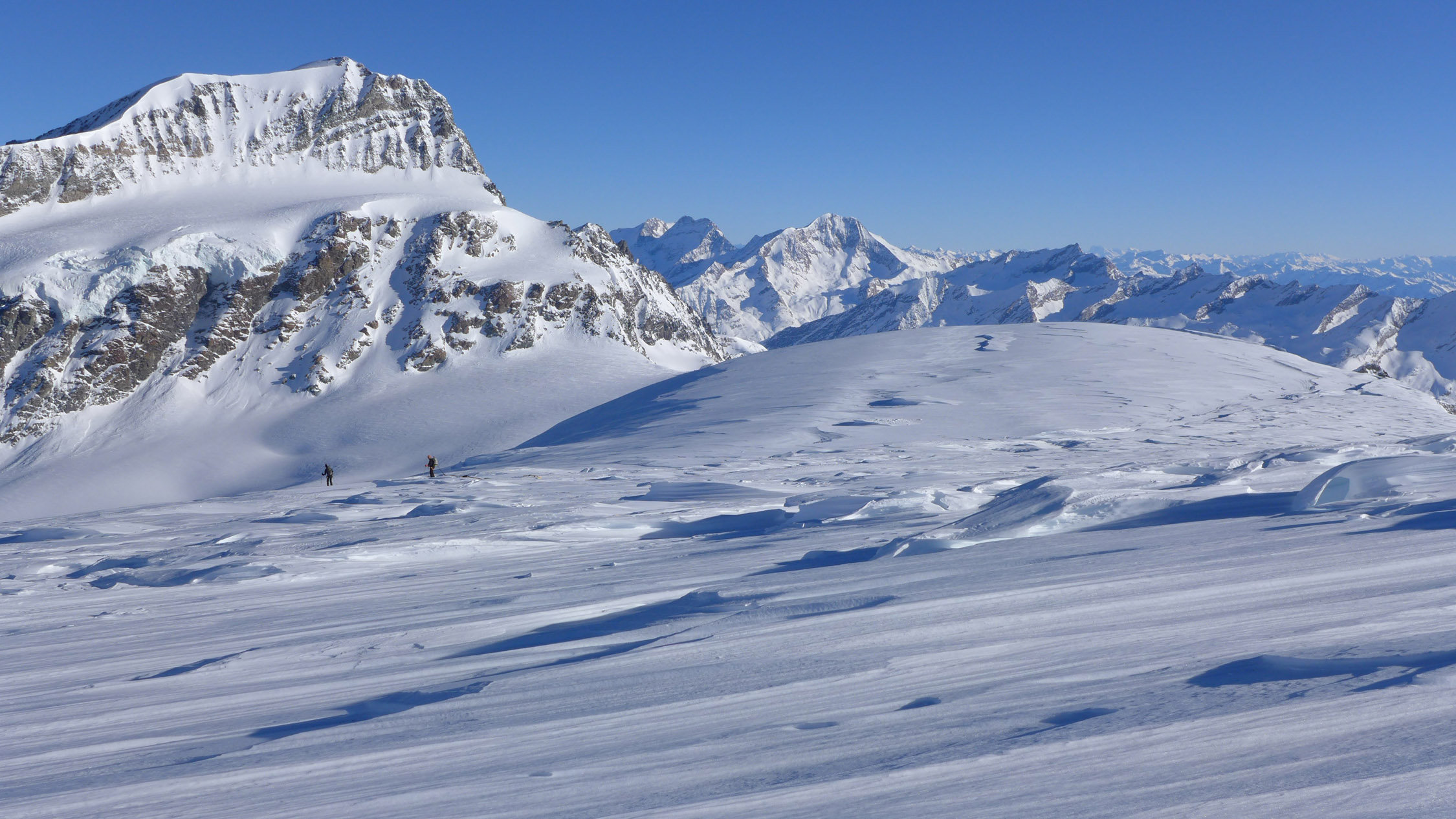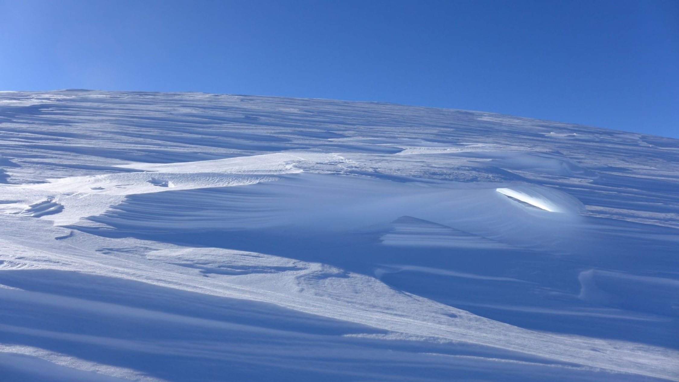 Oberhalb 3500 m: Stark windgeprägt, 150 bis 400 cm Schnee, bis zu 50cm hohe Sastrugi.