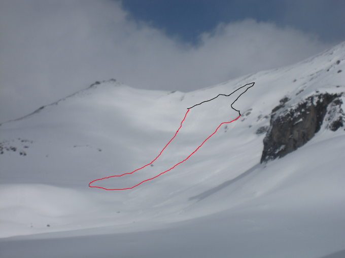 Aus dem Nordwesthang des Obers Tatelishore muss am Tag vorher auf ca. 2500m eine große Schneebrettlawine abgegangen sein, den Anriss sahen wir, als sich die Wolken mal kurz hoben. Die Ablagerungen reichten bis ins Flache unter 2300m.