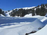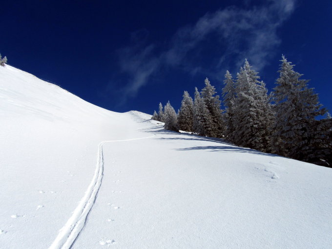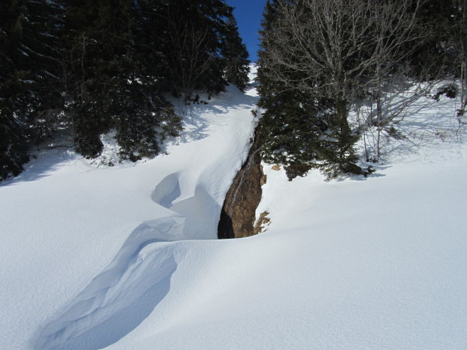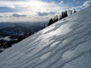 Zwischenhoch, leicht windig, kalt. Verschiedene Schneearten: die windausgesetzten Stellen z.T. eisig, die Mulden und Schläuche gut gefüllt mit sehr grobkörnigem, styroporkugelartigem Schnee. Selbst die Südseiten am Nachmittag noch nicht zu sehr aufgeweicht und noch gut fahrbar.