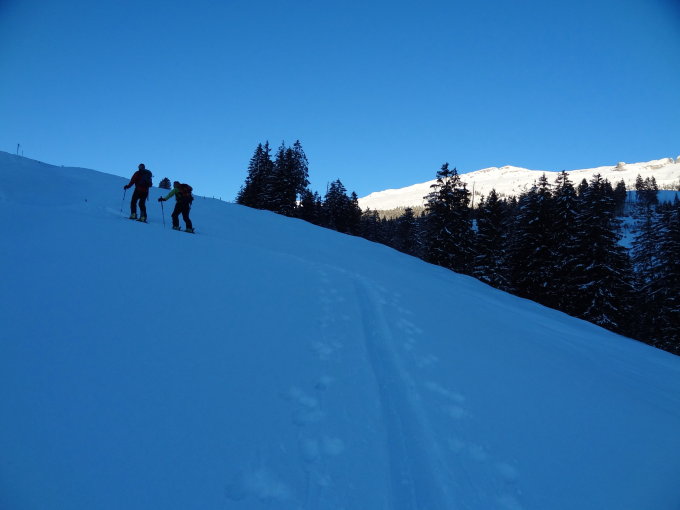 Heute musste ich mich wieder mit der z.T. steilen Spur auseinandersetzen. Nicht jeder hat Freunde die, indem sie die "strübsten" Stellen durch einen kleinen Umweg entschärfen, ihm ermöglichen den Gipfel einigermassen salonfähig zu erreichen. Herzlichen Dank meinen Begleitern.