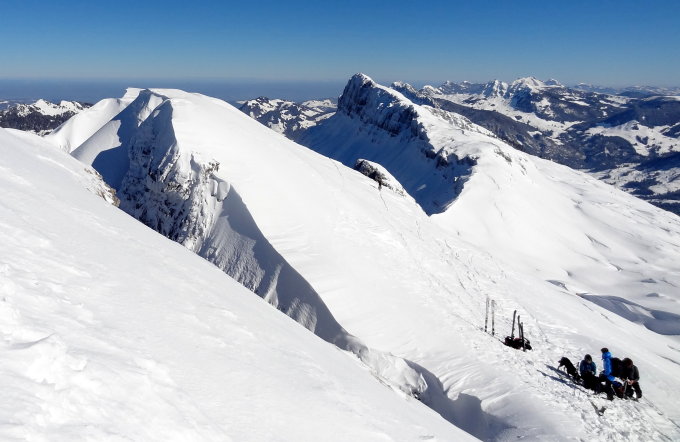 Viel Triebschnee. Die Route hat früh Sonne, dies merkte man an dem zunehmend feucht werdenden Schnee. Bei der Abfahrt um 11.15 war der Schnee immer noch recht gut fahrbar, aber nicht mehr pulverig. Sehr wahrscheinlich bildet sich in der Nacht ein Deckel, der morgen von der Sonne (2000 m./6 Grad) aufgeweicht wird. Heute waren die NO Hänge und die flachen Hänge vom Stächelegg am Besten. Bei direkter, frontaler Sonneneinstrahlung wird jeder Schnee feucht. Siehe Bilder.