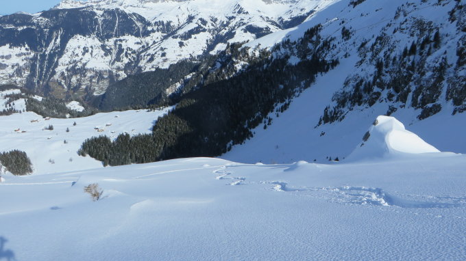 Am Berg Pulver und über's Haldi am Nachmittag sulzig.Heute 5 Personen am Berg, hat also noch Platz für viele neue Spuren.3 Personen sind über das Grätli-Stich zum Hoch Fulen abgebogen.