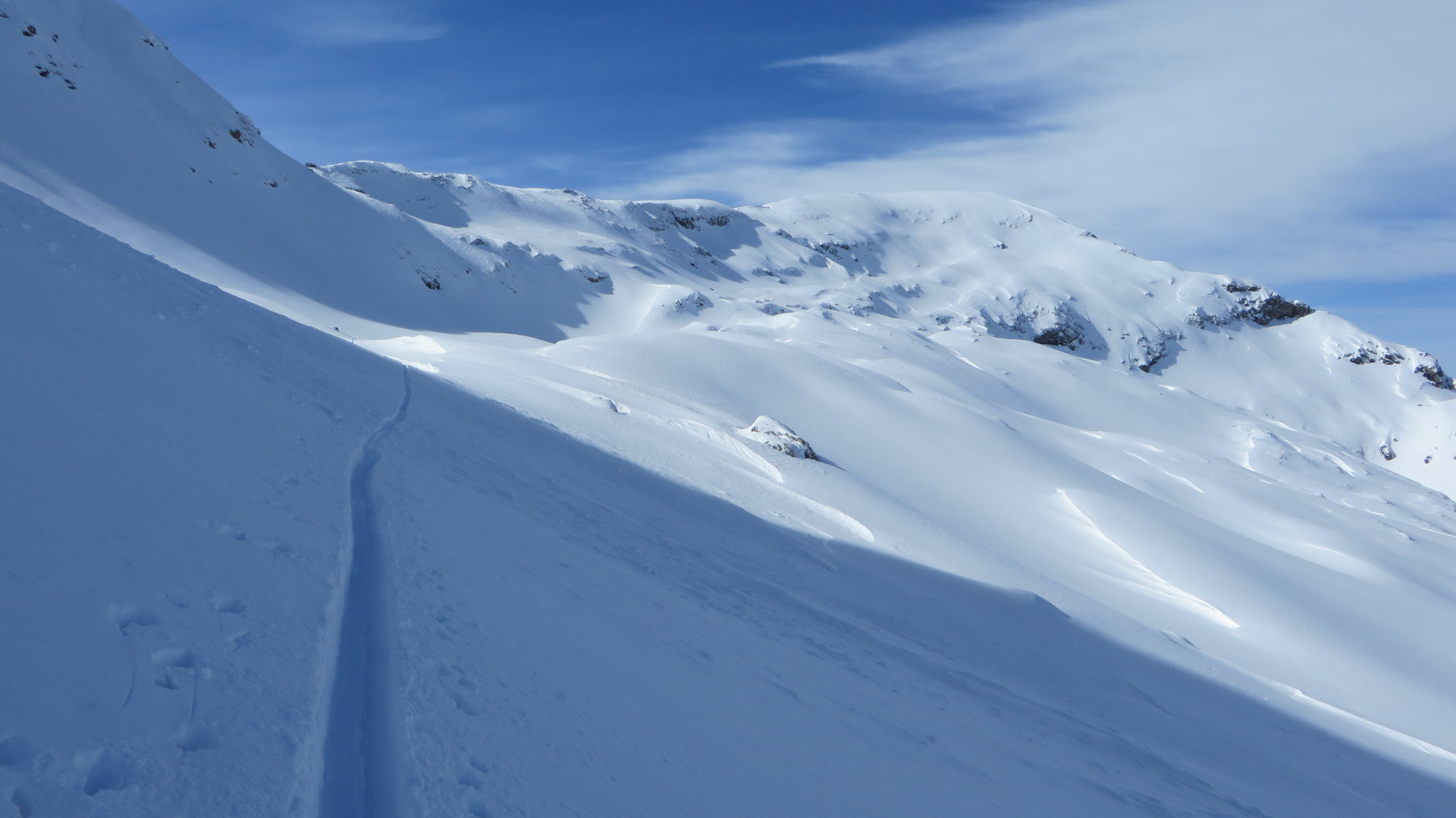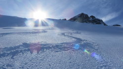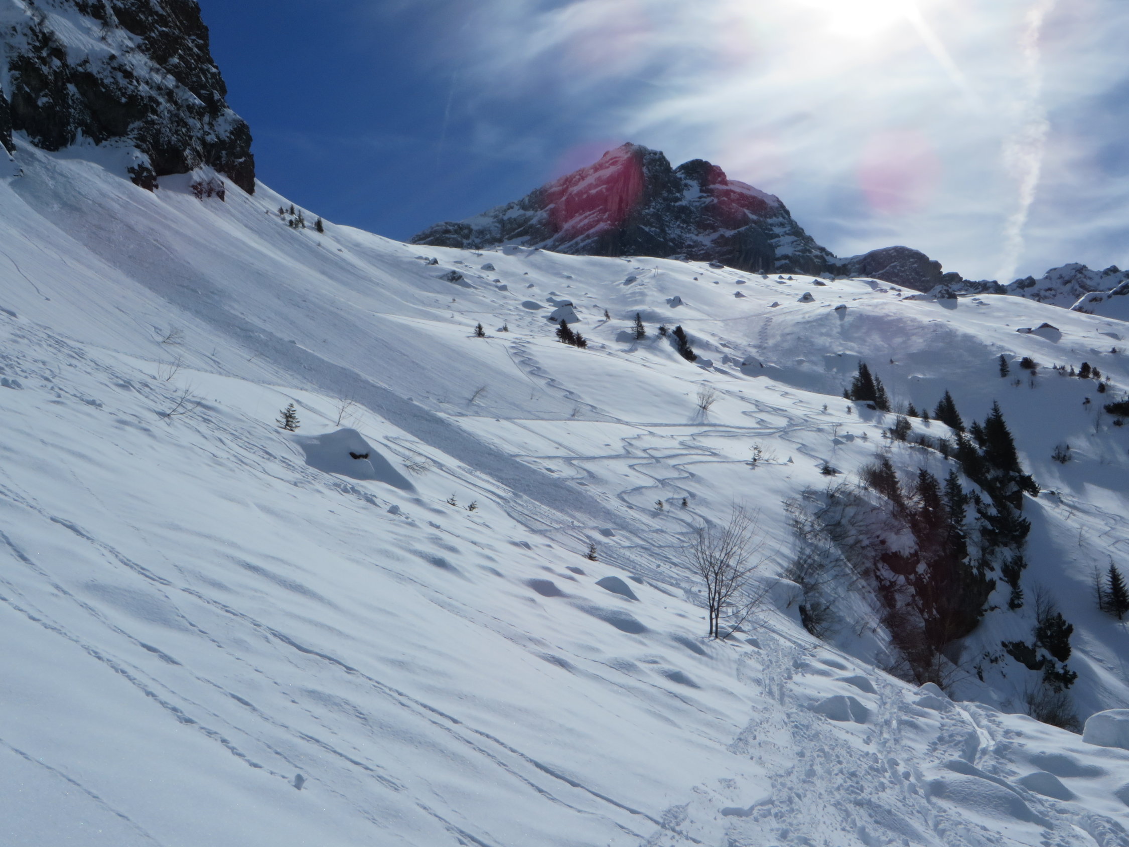Mit zunehmender Wärme können nach dem Wald vermehrt Nassschneerutsche (von der Burg) die Aufsstiegsspur überspülen.