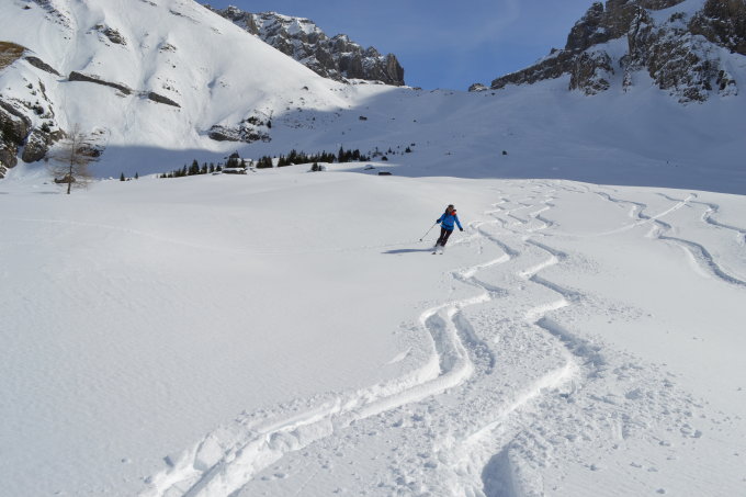 Am Gipfel Wind, aber noch zum aushalten. Abfahrt via Bunderle nach Margeli. Bis Bunderchumi hat es bereits einen ziemlich lästigen Deckel. Bei der Abfahrt etwa um 12 Uhr hatten die gut südexponierten Stellen bereits genug Sonne und der Deckel war nicht mehr allzustörend (-> schwerer Neuschnee, fahrbar). Zwischen Bunderchumi und I de Strickmatte im Schatten des Nünihorn schöner Pulver. Dann bis I de Louene am Waldrand im Schatten der Bäume auch noch pulverartig. Weiter unten bis Bunderle sogar einzelne kurze Sulzstellen.