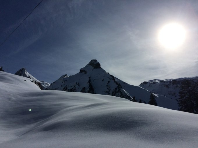 Sehr Warm, durch seine südliche Exposition Schnee sehr feucht und Sulzig. Morgen war Deckel. Ganz wenige Pulverstellen. Bereits verfahren.